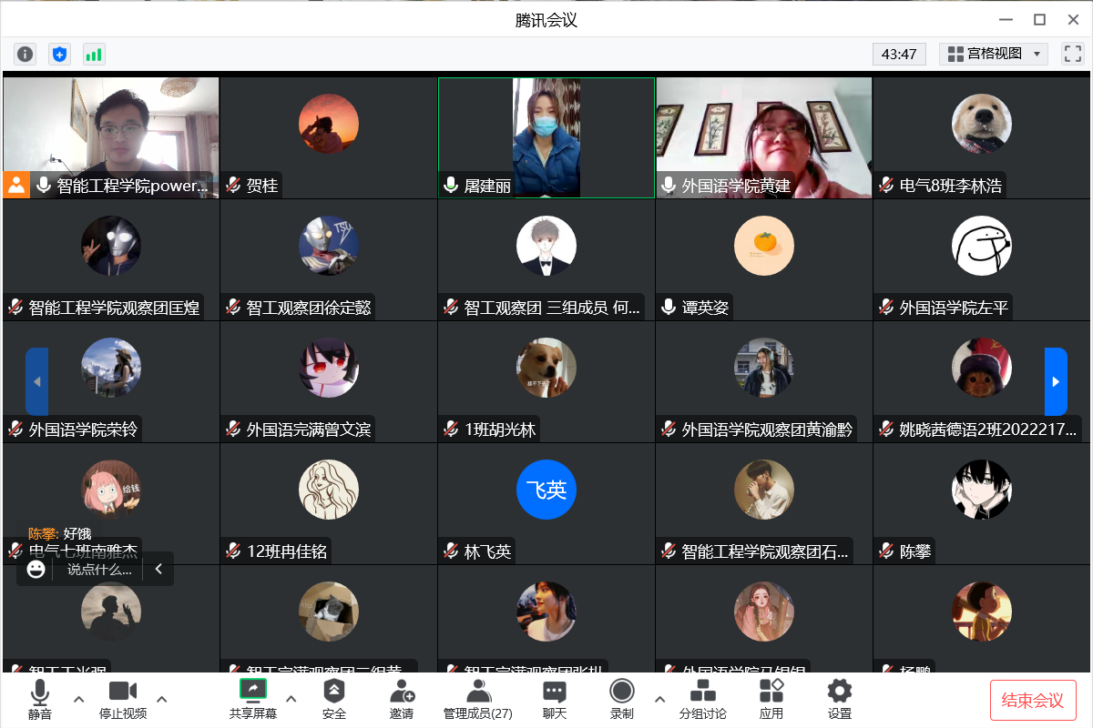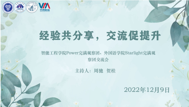 为增进两院之间完满观察团成员合作交流,更好发挥完满教育活动“温度计”的职能,2022年12月9日中午12点智能工程学院与外国语学院联合举办了完满观察团交流会。秉持“完满因交流而多彩,完满因互鉴而丰富”理念,会议邀请到智能工程学院Power完满观察团指导老师谭英姿老师、外国语学院Starlight完满观察团指导老师屠建丽老师,以及两院完满观察团全体成员。