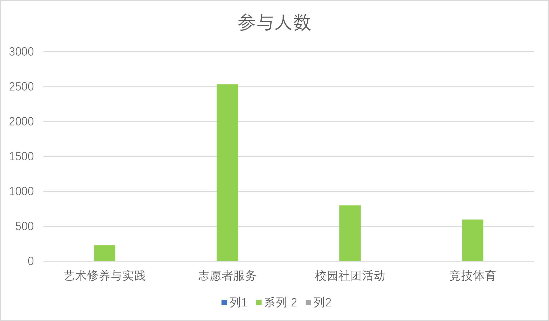 4个板块活动中,参与人数最高的是志愿者服务类活动,参与人数高达2534人次,其次是校园社团活动、竞技体育和艺术修养与实践。