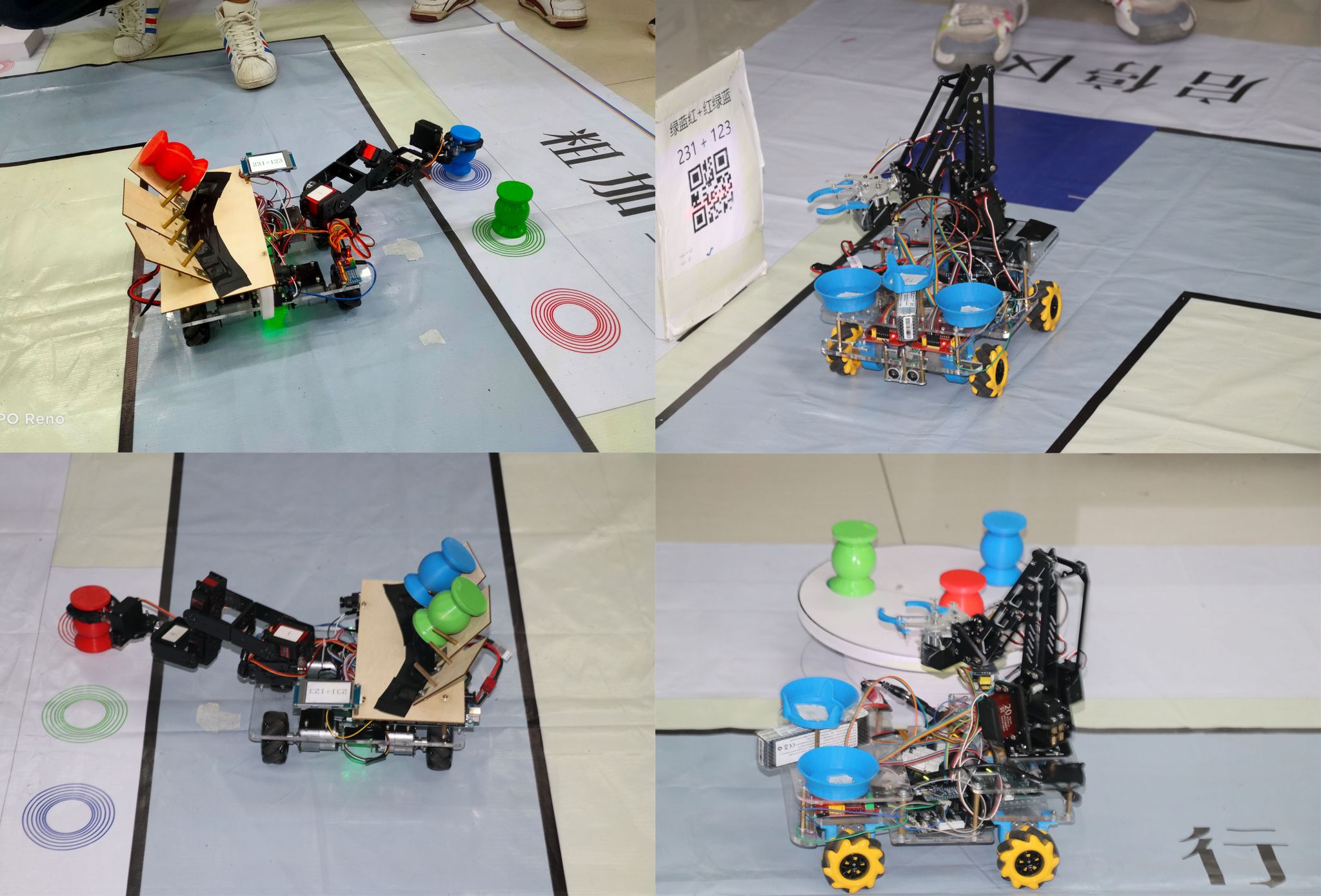 该赛项主要分为三项任务,一扫描读取二维码接收运输任务;二将物料按扫码颜色顺序搬运至粗加工区;三再将粗加工区的物料按照扫码搬运至半成品区域再返回至原料区进行第二批物料搬运。每个参赛队有两次运行机会,每次运行时间为5分钟,两次运行中间调整时间不得超过3分钟,取两次成绩中的最好成绩作为校赛最终成绩,评委们根据搬运小车对赛道各个环节的完成度进行评分。通过两轮比赛,四个小组诞生了1个一等奖,1个二等奖,2个三等奖。