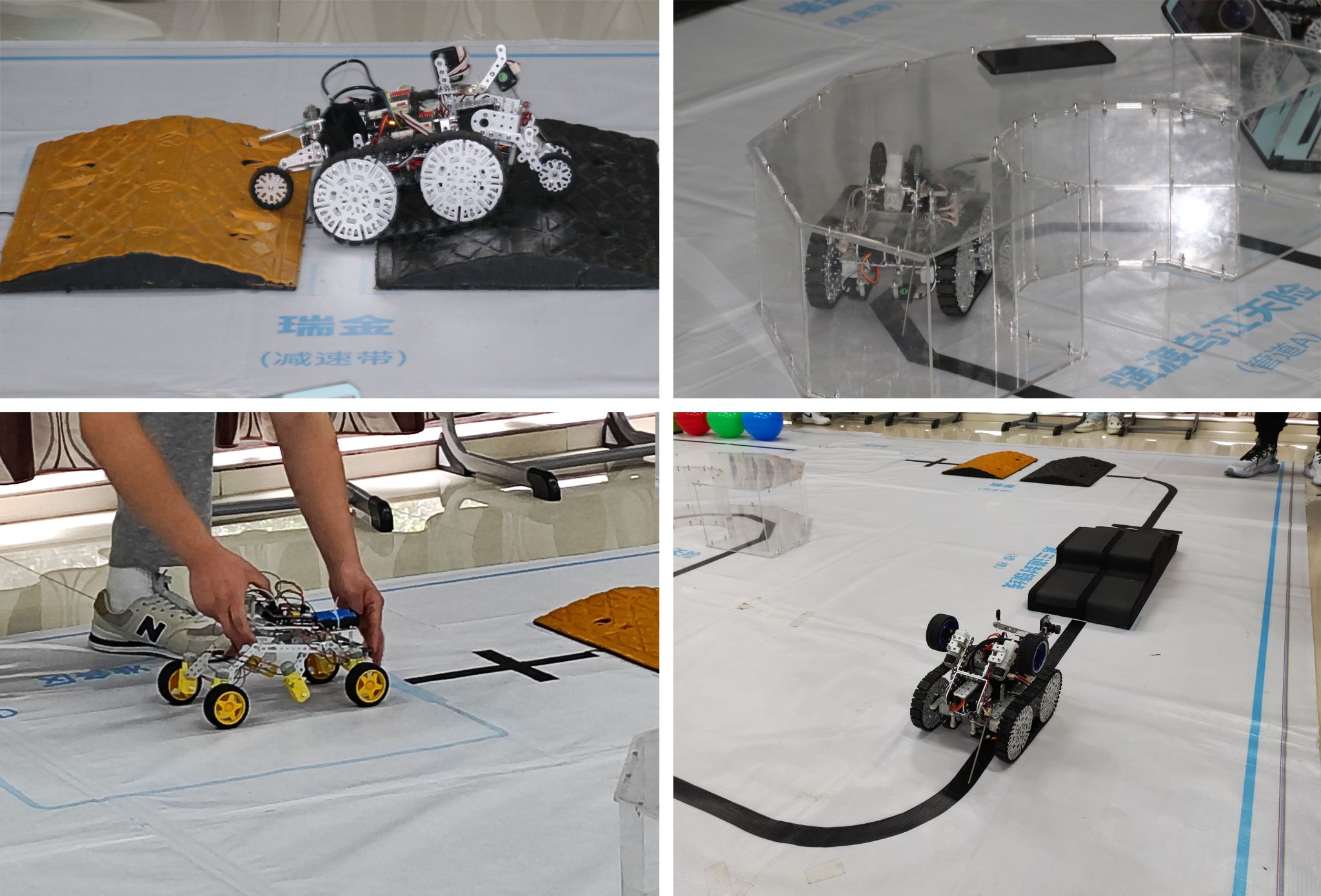 该赛项要求参赛作品自主控制,不允许任何形式的远程控制干预,并在规定时间内启动。参赛队作品从启停区发车,以任何一部分接触到终点线,作为跑完全程的标志。根据路线设置,越过大会师(草地)障碍、血战湘江(爆破区)障碍、瑞金(减速带)、第三道封锁线(楼梯)、强渡乌江天险(管道A)、占领遵义(石头地形)、巧渡金沙江(窄桥)等多个障碍。当参赛选手把作品放上赛道的那一刻,就是到了检验成果的时刻,每当跨过一个障碍,就多了一份自信、少了一份担忧。当作品顺利通过所有障碍,到达终点时,小组成员脸上的喜悦已经掩盖不住,尤其是从评委老师们的口中得知自己所在团队获得的名次后,更忍不住欢声雀跃。优异的成绩,也是未来赛事的起点,希望他们能够带着团队的成果,走得更远、走得更高。