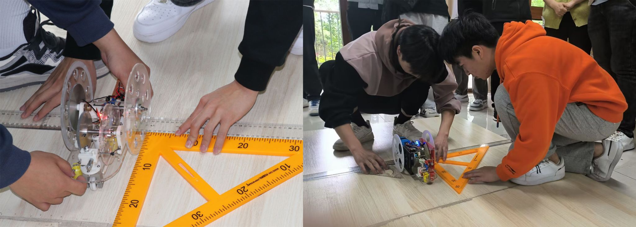 比赛现场,由各组抽签决定各参赛队伍的比赛顺序。决赛分为两个环节,第一个环节为发车运行,每支参赛队伍共有两次发车机会,每次发车的调试时间为2分钟,调试时间结束后,参赛队伍将新能源车放置在起点上方开始发车(发车时间超过2分钟不记录比赛成绩,所有成绩视为0分);第二个环节为现场打点演示,按照规定的打卡点顺序依次打卡,直至运行到终点比赛结束。在新能源车运行过程中,选手接触车体、出现错序打卡(没有按照规定顺序经过打卡点)、重复打卡,均视为本次现场运行结束。评委老师则根据选手们所用时间以及成功打点的个数,确定各小组最终成绩。纵使整个赛场弥漫着紧张的气息,但比赛中各队选手依然从容不迫、聚精会神,每当小车经过一个点位,众人纷纷屏住呼吸,都在期待传感器的指示灯能够如约亮起,生怕错过一个点位,只有当小车顺利运行到终点时,悬着的心才能放下。通过各小组的精彩比拼,最终的获奖选手也应运而生。