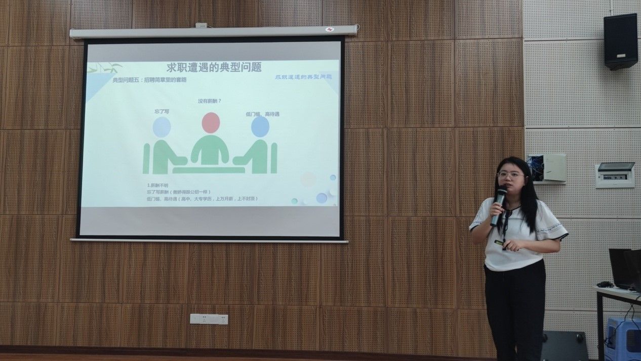 之后,刘老师还为大家介绍了如何解决求职中所遇到的陷阱。比如,一些公司会过多询问个人私密信息,或是想方设法向面试者要钱、薪酬不明、刻意混淆实习期与试用期等。当大家遇到这样的公司时,一定三思,以免进入求职陷阱。同时,刘老师也激励同学们抓紧在校时间认真学习,不断提高自己的综合素质,为自己选定适合自己发展的职业生涯路线。
