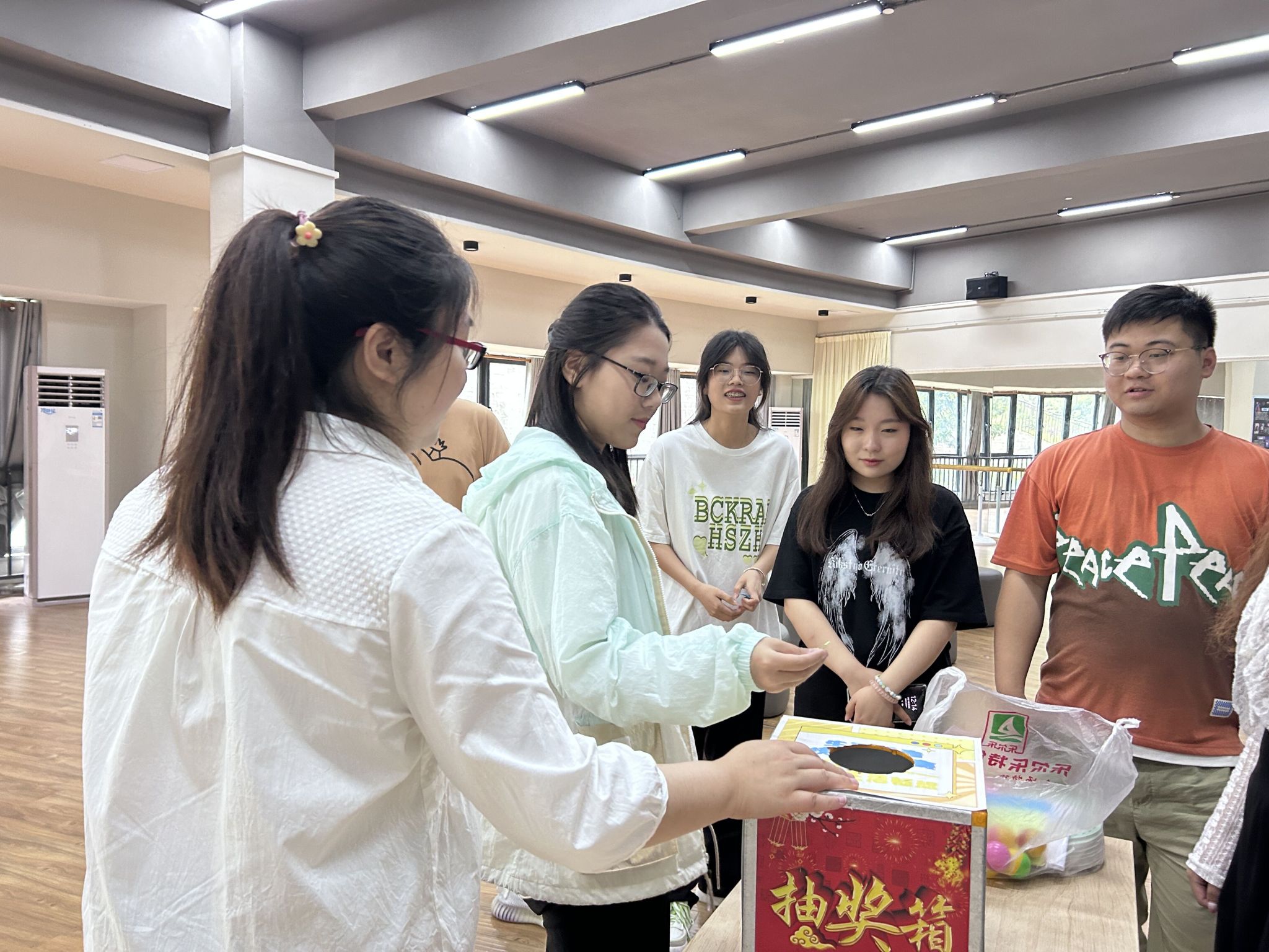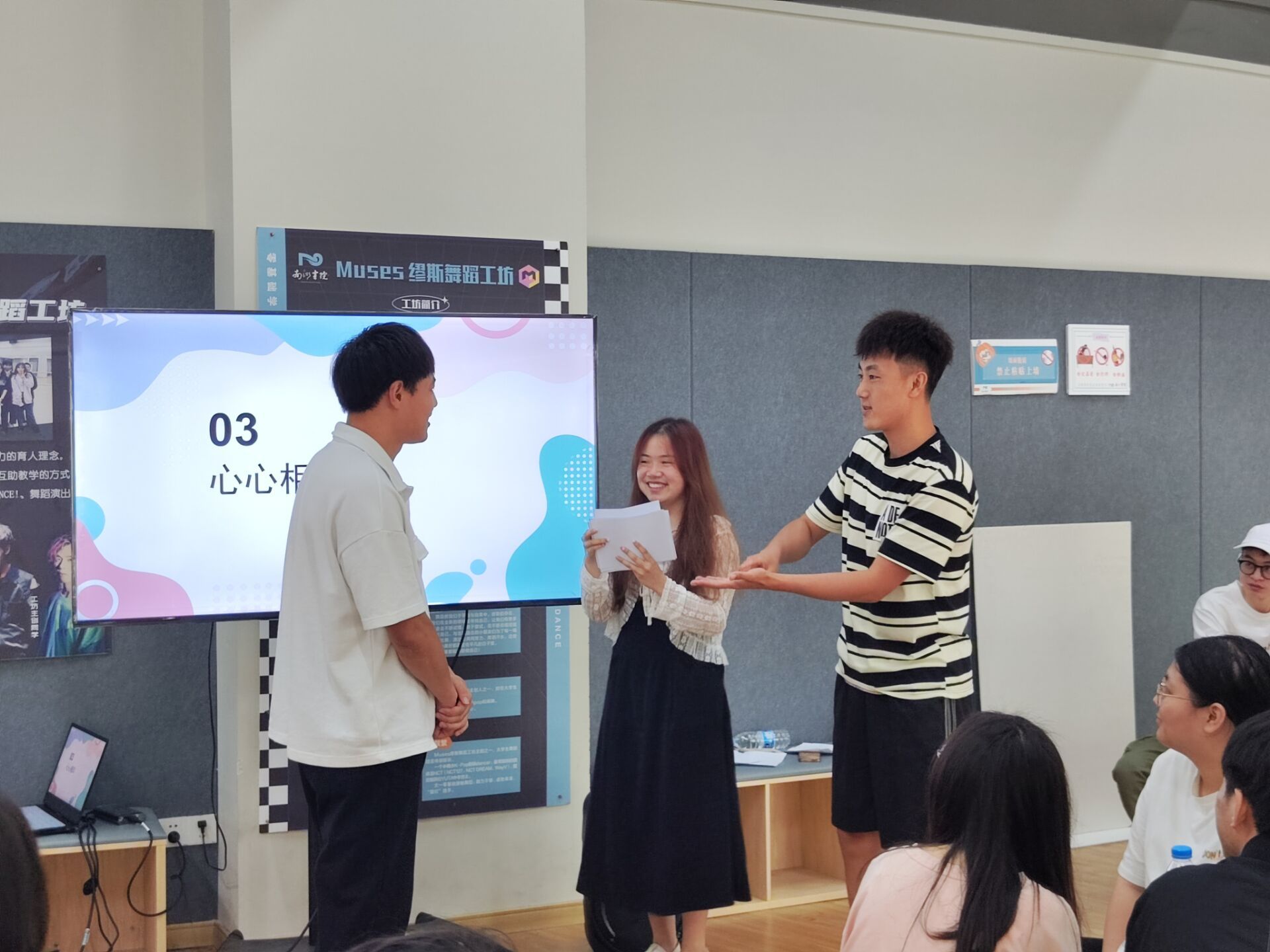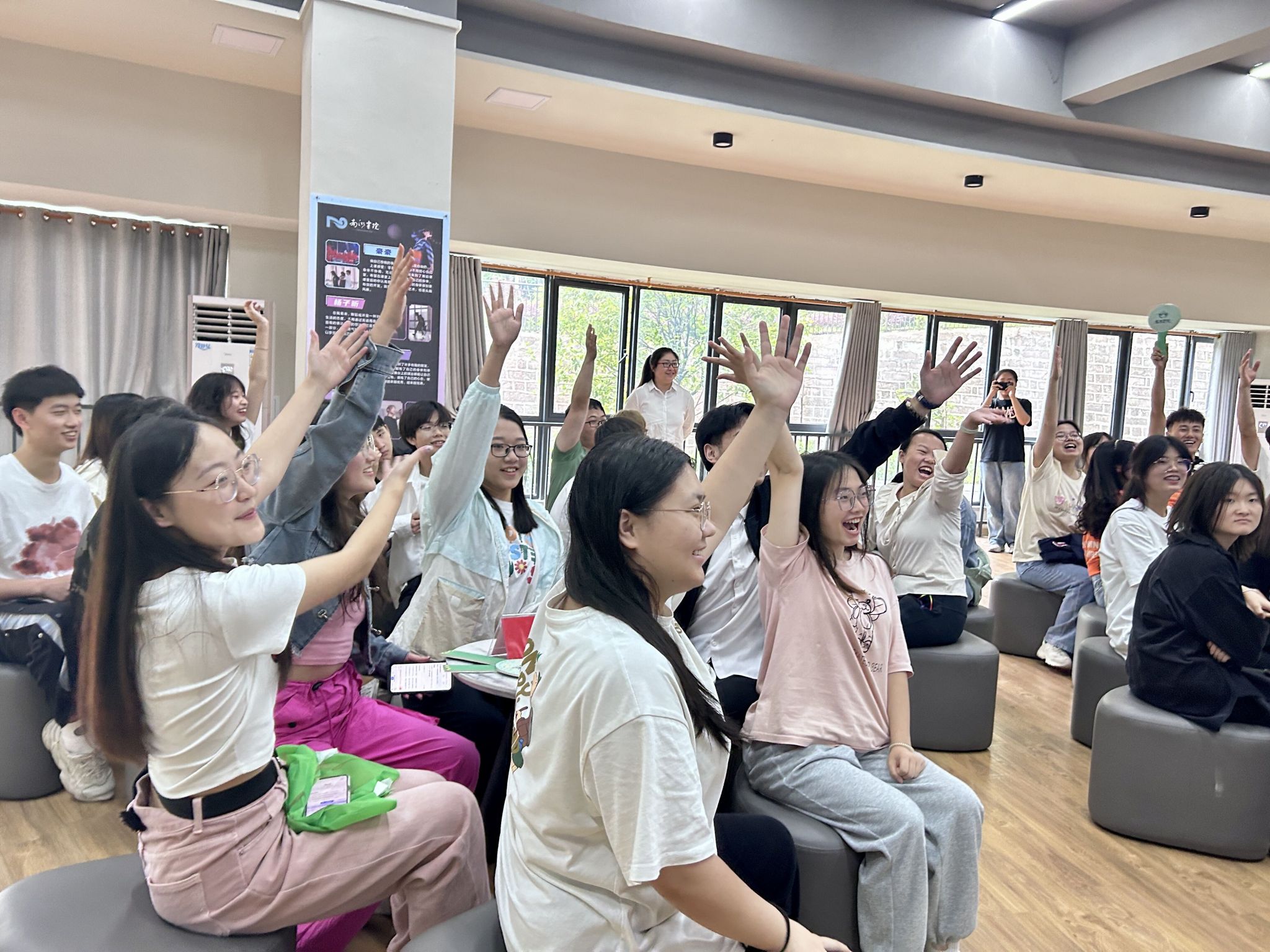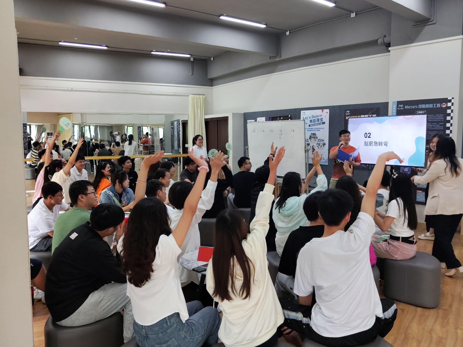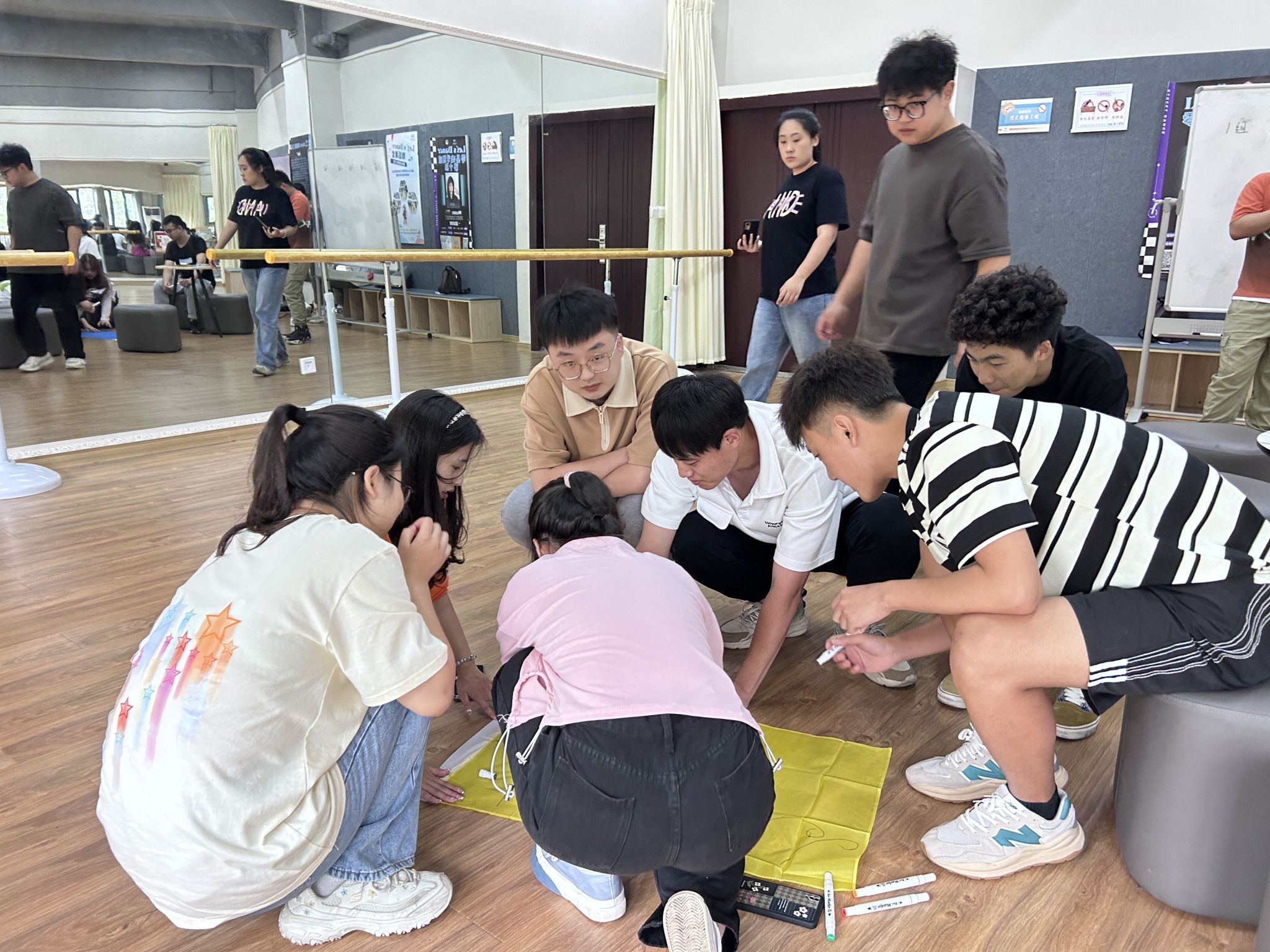 5月19日中午12:30,来自艺术传媒学院、智能工程学院、淬炼·国际商学院的三位异科导师吴静、杨敏、刘月分别带着各自异科导师组的30余名学生,在南湖书院形体室进行了一场以“青春的无限可能”为题的异科班联动团建活动。活动旨在丰富大家的课余生活,增进班级间的友谊,培养同学们的团队精神和协作能力。