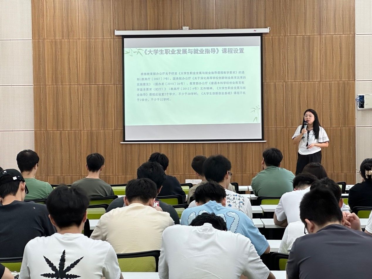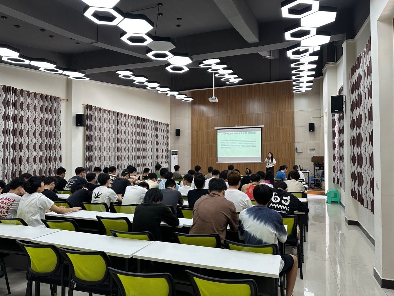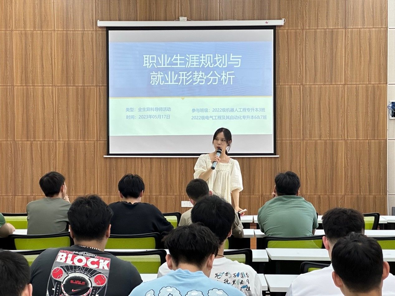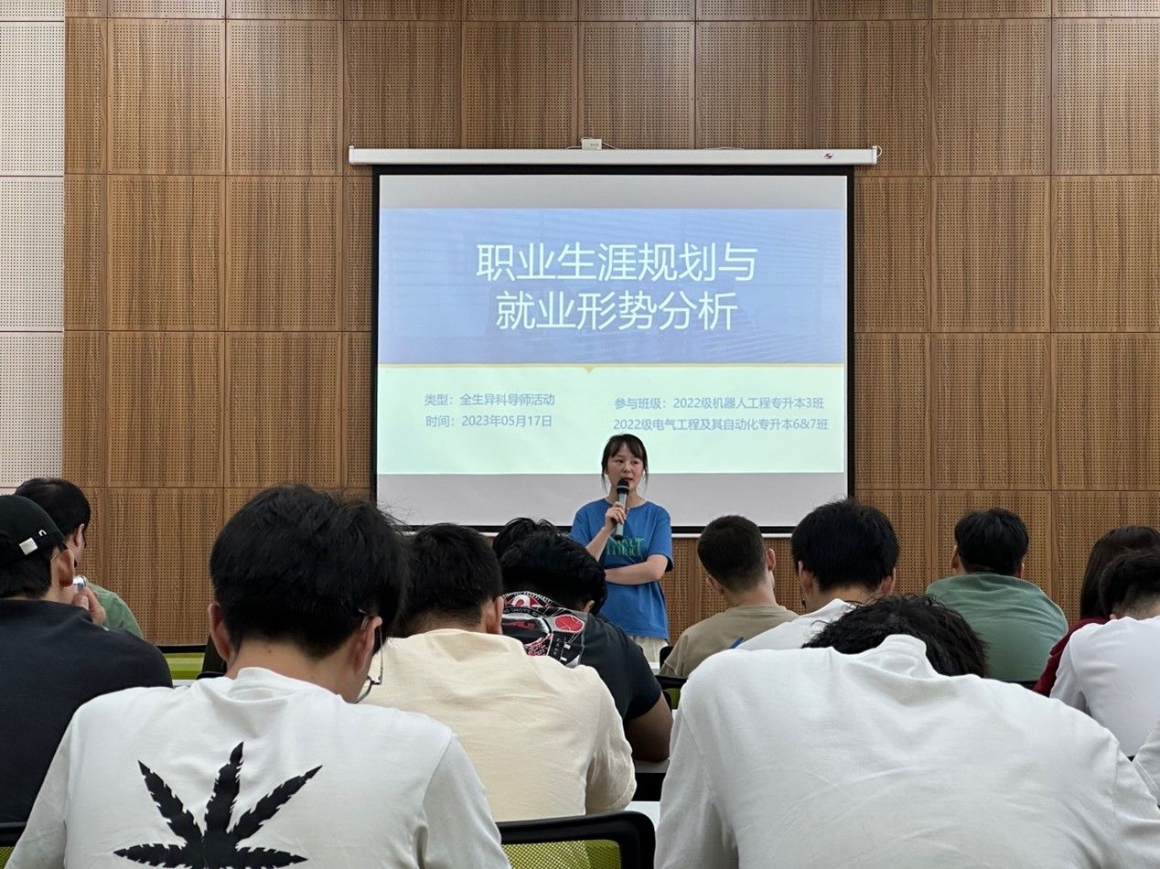 5月17日中午12:30,智能工程学院异科导师张娅、杨敏与其指导的2022级机器人工程专升本3班、2022级电气工程及其自动化专升本6班、7班全体同学,在天渠书院111报告厅开展以“职业生涯规划与就业形势分析”为主题的全生异科导师活动。本次活动邀请到了学校就创中心刘籽圻老师,以期能帮助同学们了解当前就业形势,舒缓就业压力,增强求职竞争力,做好就业准备。首先,由杨敏老师介绍本次就业指导活动的受邀嘉宾刘籽圻老师。活动伊始,刘老师从课程设置、就业环境分析、就业去向、求职遭遇的典型问题四个方面为同学们进行相关讲解。