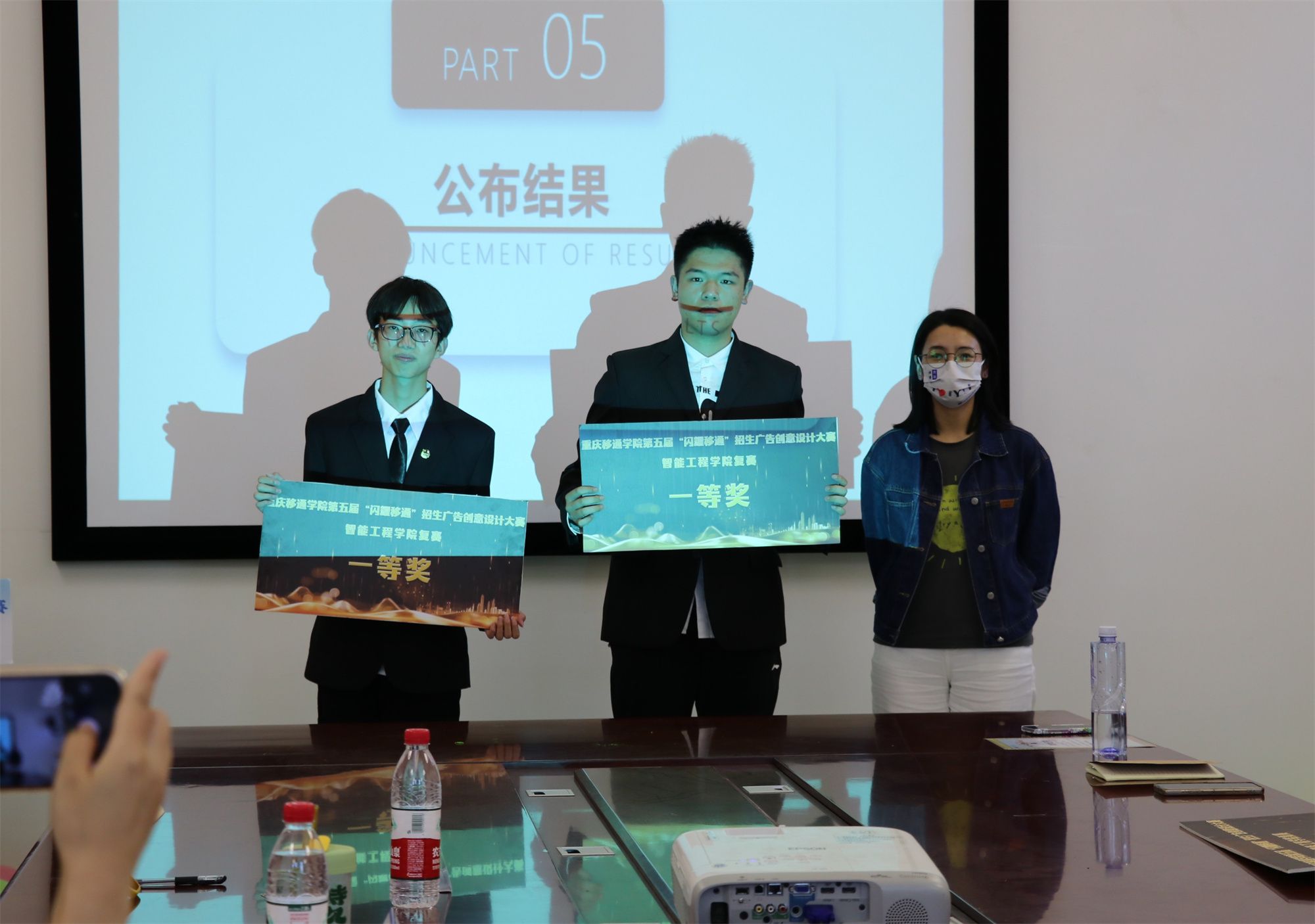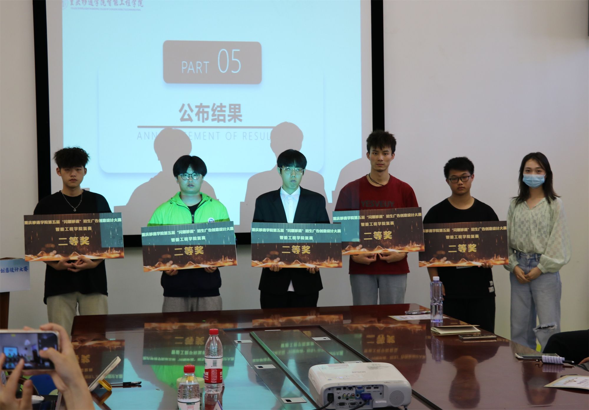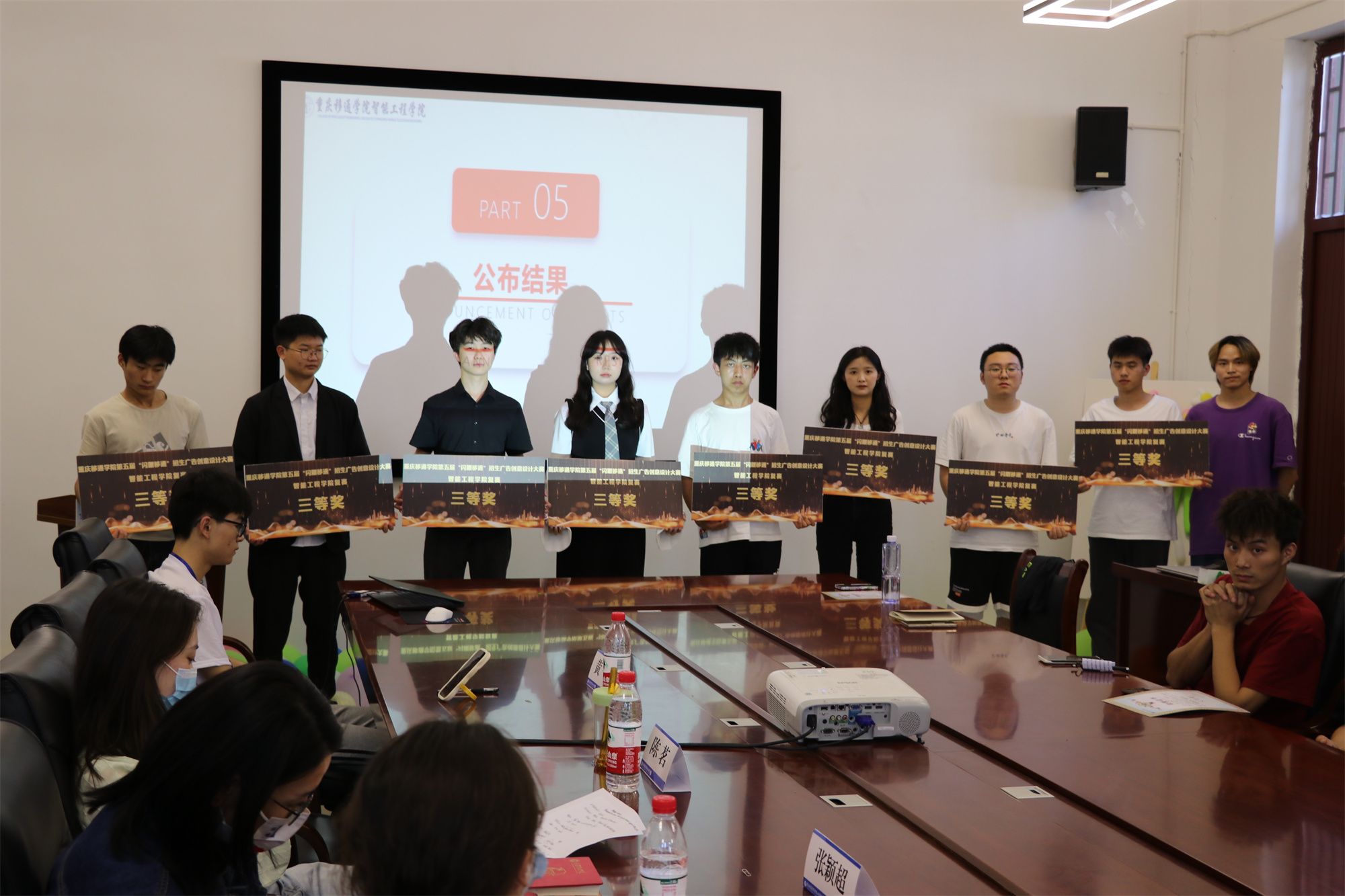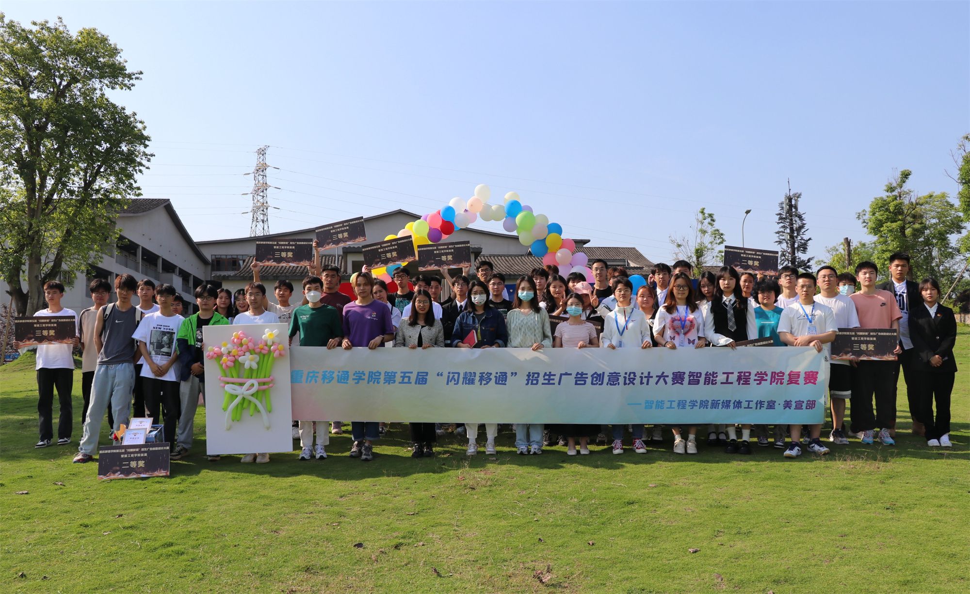 大赛最后由学院团总支书记张颖超老师对参赛作品以及选手答辩情况进行总结性发言。张老师表示每支队伍的作品都创意十足,在兼顾创意性、实用性、美观性的同时富有表现力,不仅广泛宣传了学校的校园文化,凸显学校办学理念以及办学特色,同时也体现出团队成员之间的团结协作,更体现出智工学子创新创造的意识与能力。在发言结束后,由各位评委老师依次上台为获奖队伍颁奖并合影留念。颁奖结束后,所有人在工作人员的引导下移步至草坪处合影留念,至此,智能工程学院第五届“闪耀移通”招生宣传广告设计大赛复赛圆满落幕。