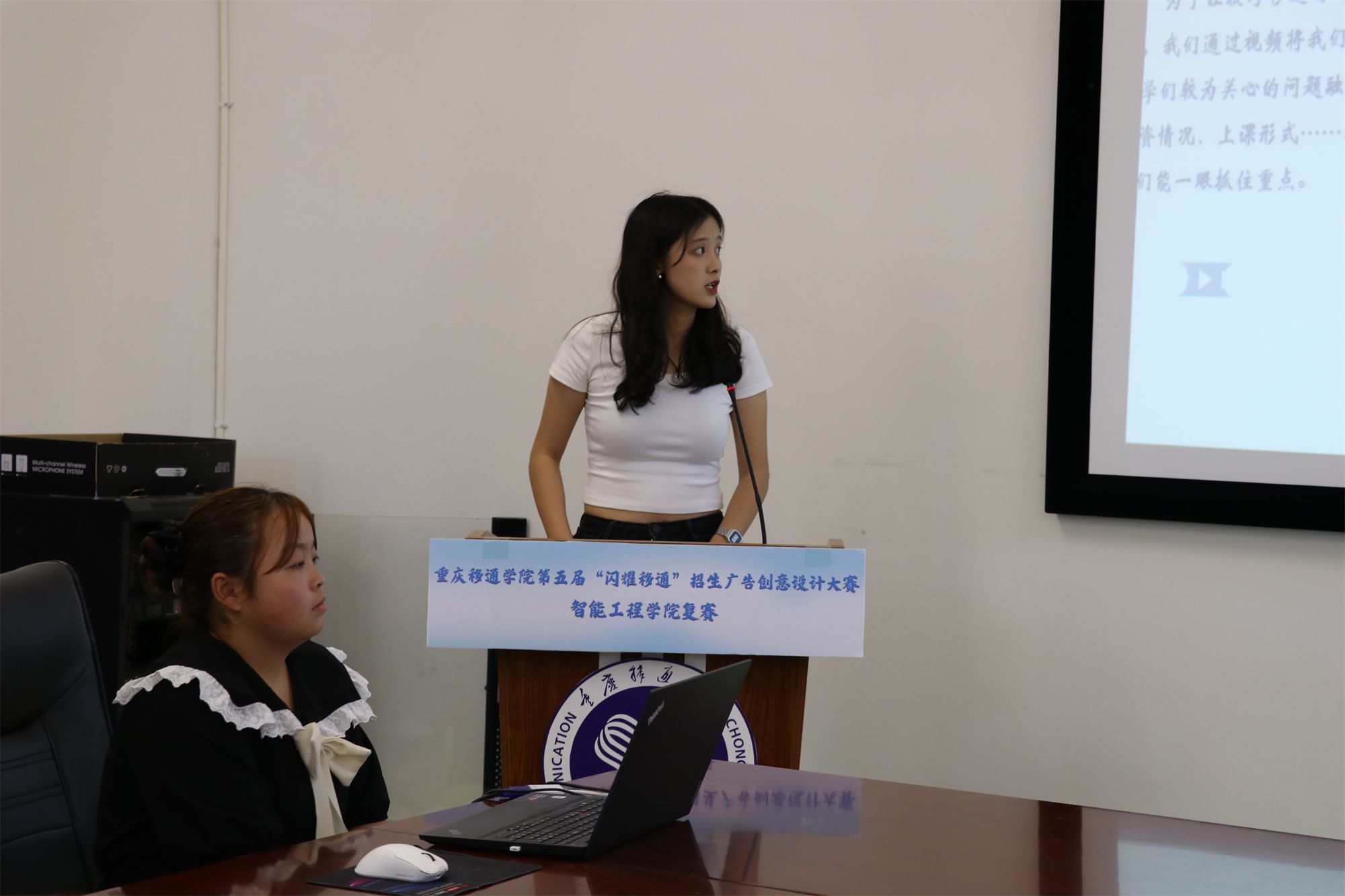 高校招生宣传广告能在短时间内简洁集中地介绍高校的特色,有利于帮助高校在更大的范围内做好高校形象建设、高校软实力传播的效果,进而促进学校的蓬勃发展。为进一步提高我校在校生能力以及学生生源质量,推进我校招生计划的顺利进行,贯彻落实完满教育,2023年5月12日,由重庆移通学院主办,智能工程学院新媒体工作室及美宣部协办的重庆移通学院第五届“闪耀移通”招生广告创意设计大赛智能工程学院复赛在梅若207会议室顺利举行。本次复赛有幸邀请到学院团总支书记张颖超老师,辅导员黄一、陈茗、李珊珊、谭英姿、金光源老师担任评委,新媒体工作室干事刘佳欣担任本次大赛的主持人。