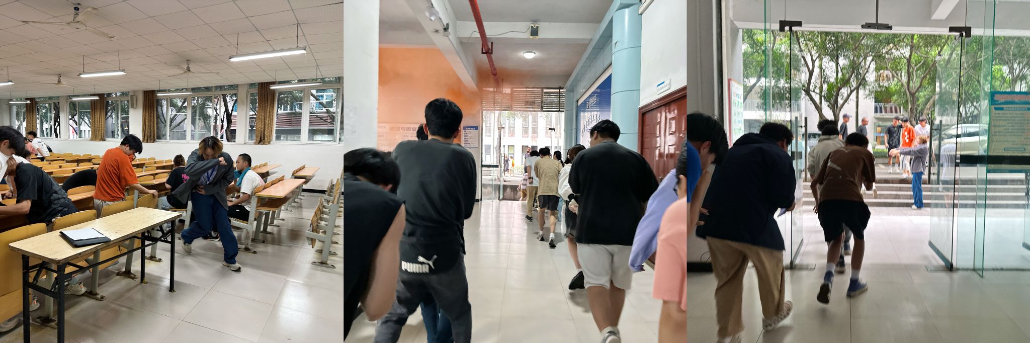 随着彭处长的哨声响起、烟饼燃烧,全体成员有序疏散至室外,在演练过程中,保卫处领导悉心指挥,所有成员竭力匍匐前进、模拟打湿袖口/衣物、捂住口鼻、有序退场、做好疏散人员报数工作,以确认所有人员均离开危险环境。