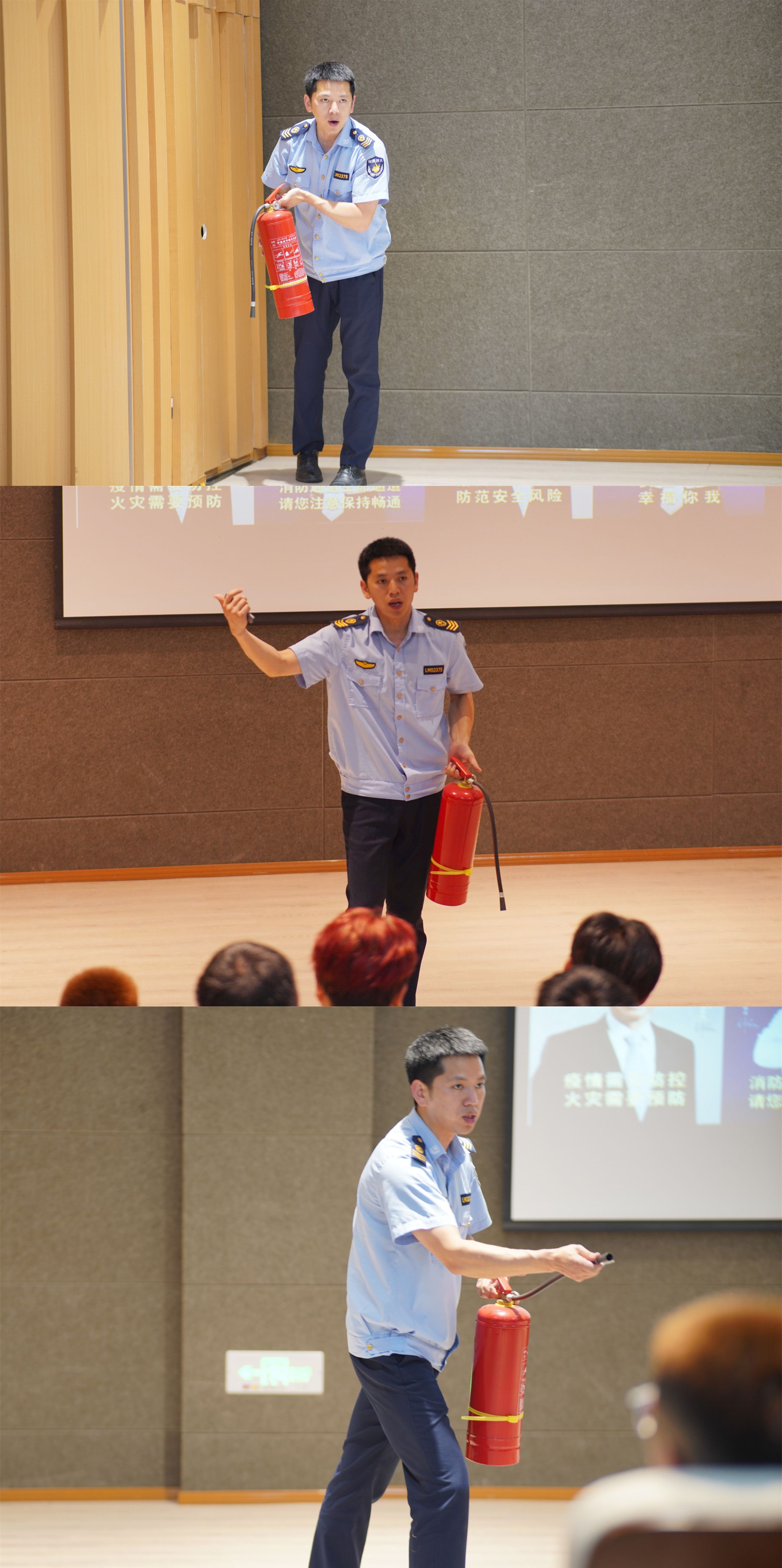 在对自保问题进行了讨论后,熊教官就“如何预防火灾、如何应对火灾”这一命题展开论述,带领同学们排查自己所处环境(教室、宿舍、家中等)的火灾安全隐患,如环境是否置办烟感器、学生是否清晰环境中电闸及消火栓所在位置等。随后,熊教官向同学们示范了灭火器的正确使用方法,讲解了灭火器使用期间的注意事项,如切忌忘拔保险销、需手握喷嘴以便控制喷射方向等。