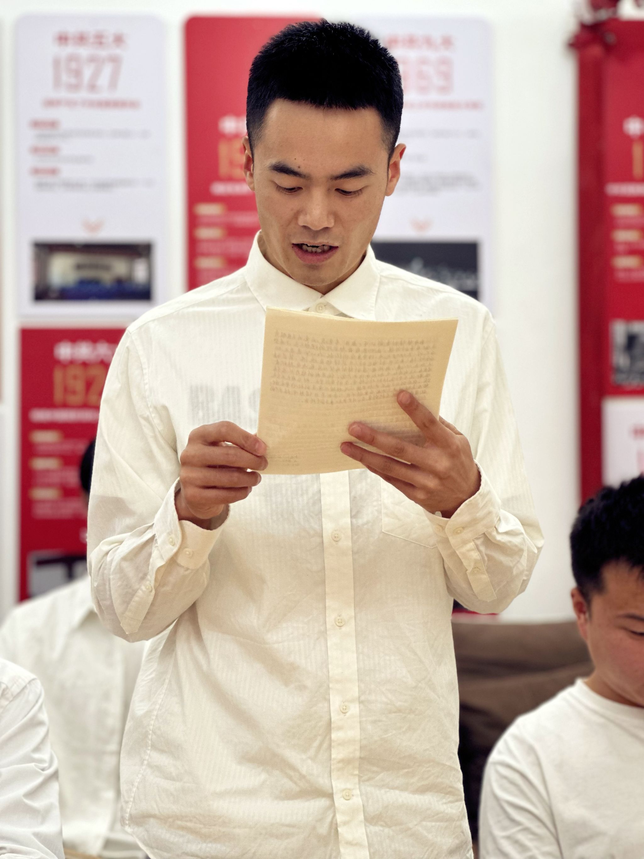 同志们手持写稿,铿锵有力地朗读稿纸中每一个汉字,向党组织提出入党/转正申请。马鑫等同志向党组织汇报了自己对党的决心和对党的向往,表示为党的工作奉出自己的一份力量,为共产主义事业奋斗终生,表达了他们入党的愿望和自己作为预备党员期间的表现,提出了转正申请。