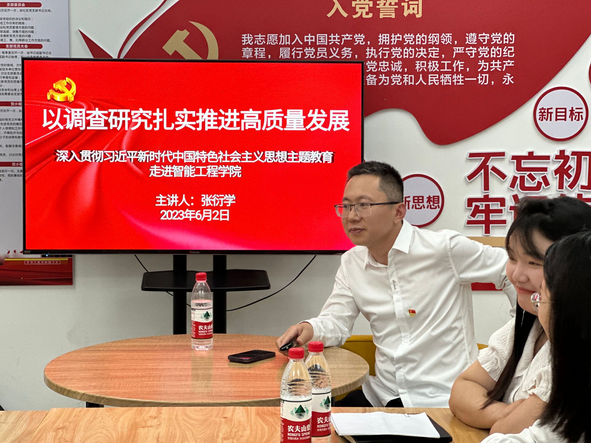 随后进入会议第二项议程,由副校长张衍学讲主题党课,开展深入贯彻习近平新时代中国特色社会主义思想主题教育,参会全体党员同志领会党课精神并分享学习心得。会议上,张衍学同志强调我校师生进行习近平新时代中国特色社会主义思想主题教育的重要性,以及开展基层调研的必要意义。