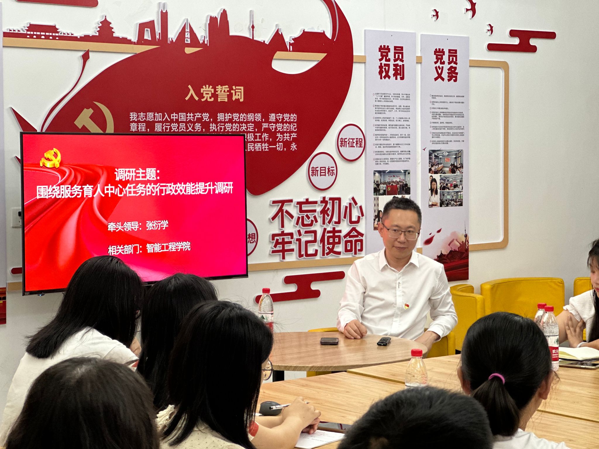 会议伊始,副校长张衍学向智能工程学院参会教师党员致以亲切问候,对智能工程学院近期所开展工作给予肯定及鼓励,同时热情询问学院发展近况、点明会议目的,邀请参会党员同志积极发言、踊跃分享关于我校“围绕服务育人中心任务的行政效能提升”的相关意见、建议。