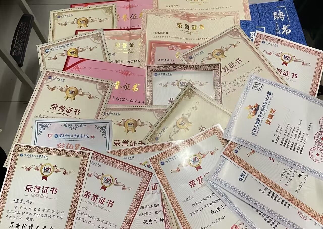 获得全国高校商业精英挑战赛“中图科信杯”品牌策划竞赛全国总决赛暨(新加坡)全球品牌策划大赛中国地区选拔赛一等奖、一带一路暨金砖国家技能发展与技术创新大赛——城市轨道交通运营设计与应急处理赛项(本科组)二等奖、“请党放心·强国有我”2021全国大学生“千校千项”网络展示活动“青春影像”奖、“第十五届全国三维数字化创新设计大赛”国家级三等奖、2021年“镜头中的三下乡”优秀摄影团队、“演绎非遗之美,绽放女性风采”实践团获“镜头中的三下乡”优秀视频团队奖、2023年重庆市高校学生先进个人“优秀学生干部”、“第15届3D大赛命题挑战赛(总第15季)”二等奖、“第15届3D大赛命题挑战赛(总第16季)”三等奖、“第15届3D大赛命题挑战赛(总第20季)”三等奖、第十二届全国大学生电子商务“创新、创意及创业”挑战赛校级赛一等奖、智慧交通科技创新大赛暨第十八届全国大学生交通运输科技大赛校内一等奖、重庆移通学院“领袖力量·向光而行”首届“户外领导力”极限挑战赛三等奖、“聆听心声,述心而发”第六届心理微课讲课大赛三等奖、第十二届全国大学生电子商务“创新、创意及创业”挑战赛重庆赛区选拔赛分组赛三等奖、2022年“‘綦’心协力,‘合’刃防诈”防诈vlog短视频大赛获得二等奖、重庆移通学院文明寝室、智能工程学院《完满梦想家》寝室接力传唱荣获二等奖。