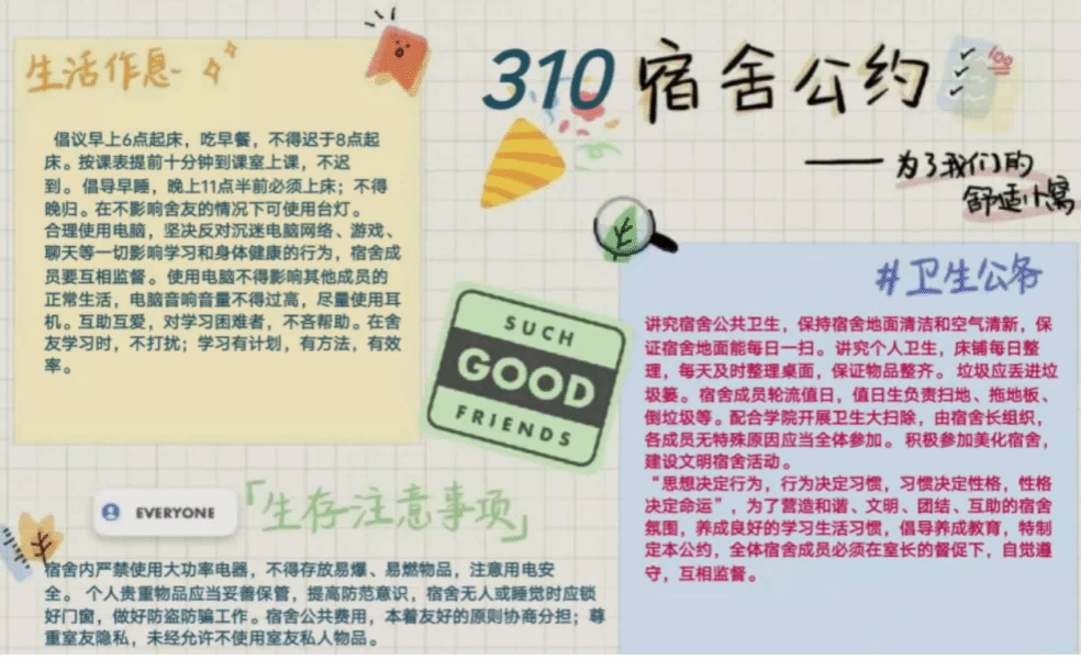 在学习上,全体成员勤奋学习,将学习当成“比赛”,相互监督,有问题相互讨论,营造良好的学习氛围,并且3位成员获得奖学金。在生活上,遇到不能解决的问题,及时向辅导员老师求助,是他为寝室和谐发展助她们一臂之力,除此之外,寝室成员积极参与寝室劳动,自觉维护环境卫生,将寝室布置成家的味道,并且寝室长自制“寝室公约”,规范寝室相处制度,避免出现矛盾。能够在同一个宿舍学习与生活,是来之不易的缘分,她们在寝室公约的规范下,共同创建良好的寝室环境,这是一份沉甸甸的承诺,更是满当当的友谊!