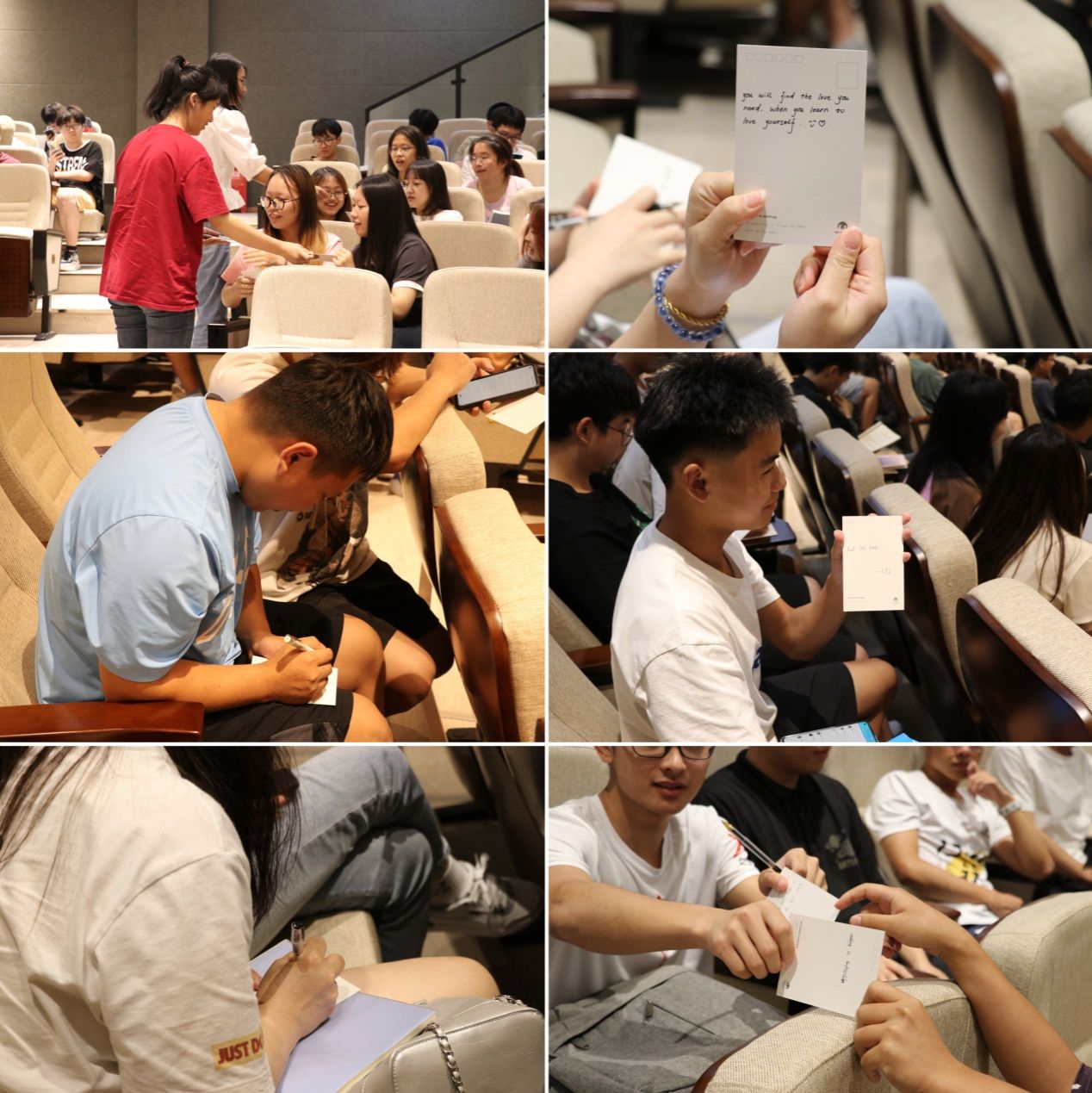 年级会的最后,工作人员向同学们分发了定制的明信片,让大家在明信片上用英语写上一句名言或者激励话语,大家都很认真的写下自己喜欢的祝福。随后,进行交换环节,同学们将卡片相互交换,将鼓励和温暖传递,以此来祝福同学们期末考试通过!英语四级考通过!