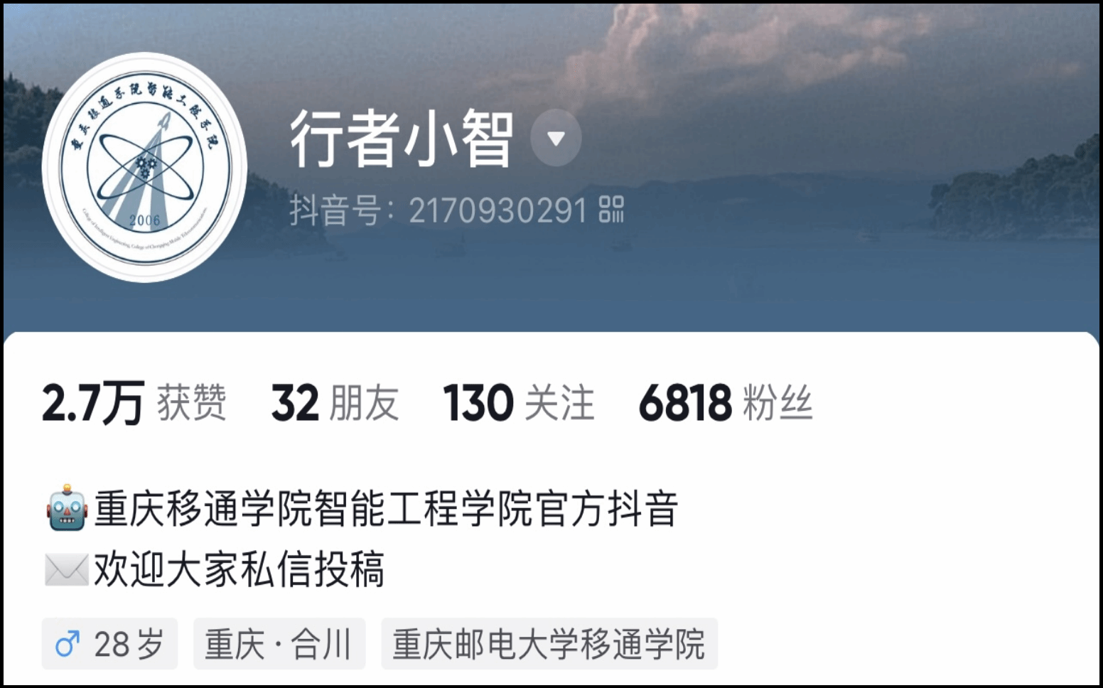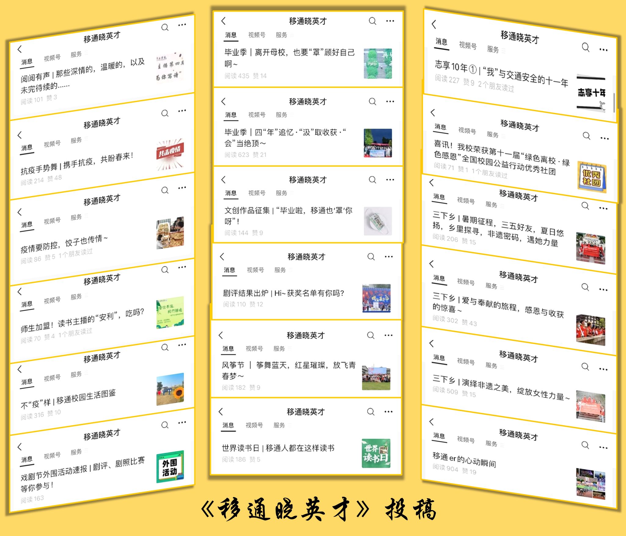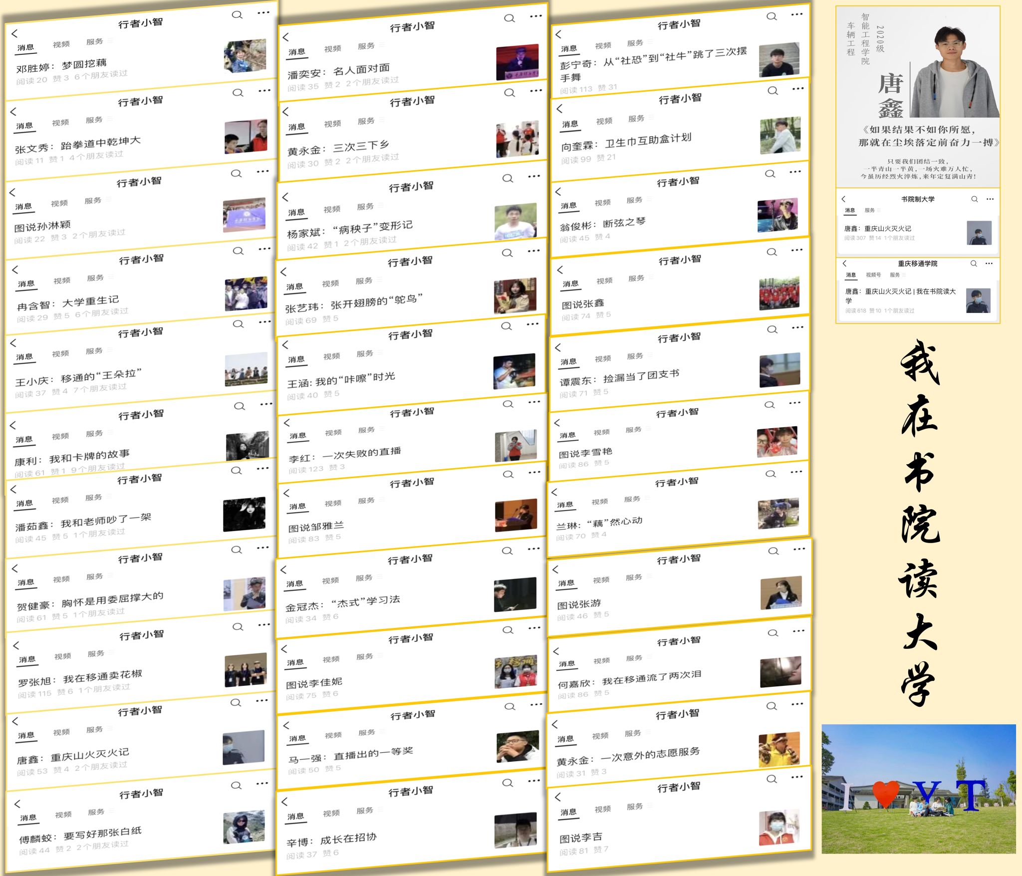 在与学校官方新媒体平台交流方面,学院官方微信公众号《行者小智》与《移通晓英才》的互动是相互合作相互成长的基础,2022年度新媒体工作室积极向《移通晓英才》校级公众号投稿18篇,每一篇稿件不仅是向学校展现我院的学生风采以及完满活动特色,更是向社会展现我校学生的风范。这期间,校、院两级平台本着共赢的原则,将宣传学校学院特色以及营造有利于社会进步的舆论氛围和思想基础放到首位,以完满教育为基石,以四位一体为准则,弘扬宣传重庆移通学院的风采。