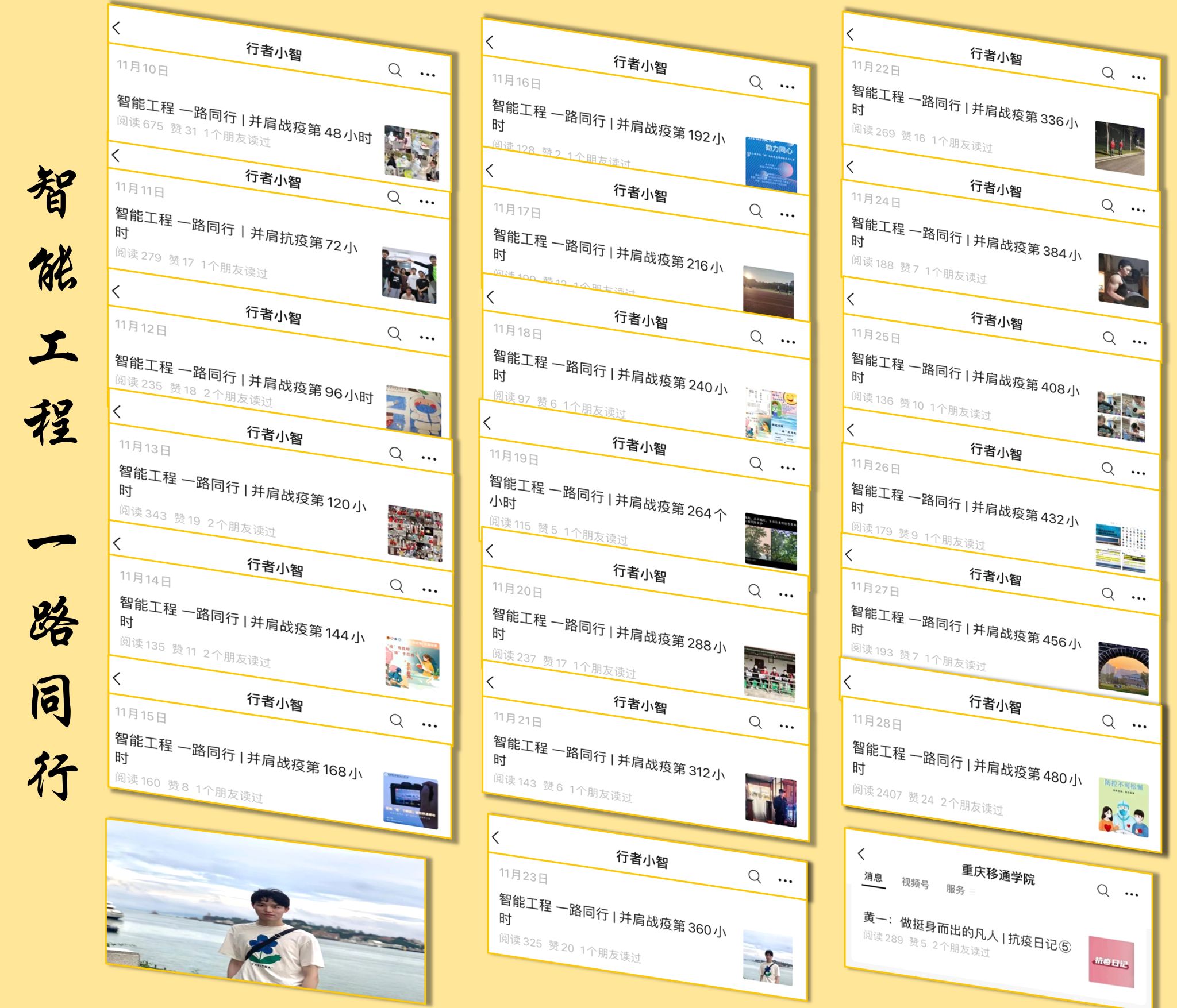 2022年11月疫情期间,《行者小智》将《智能工程,一路同行 | 并肩战疫第xxx个小时》从第0小时做起,一直做到480小时(连续坚持20天),保持日更状态,20多个日夜,凝聚的恰恰就是每个人对《行者小智》的热爱寄托以及期盼,大家通过平台账号,给奋斗在一线的医护工作人员以及老师们报以感恩,给在封寝、封楼、封校的同学们带来别样的快乐与感动。