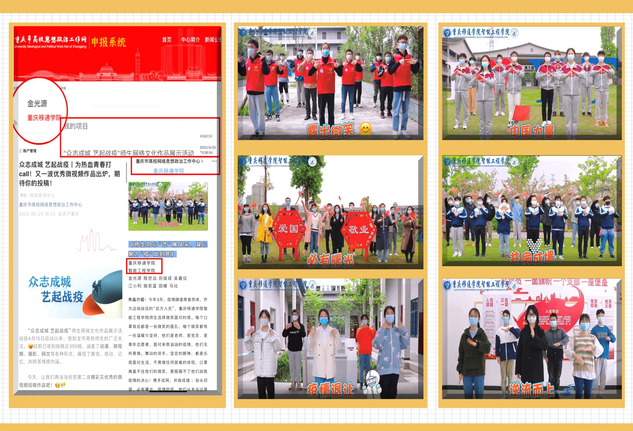 2022年度,着重培养宣传部门学生干部的创新能力,学院学生工作办公室全体辅导员老师参与、动员学院团总支、学院学生党员代表、学院优秀学生干部代表、学院各年级各专业学生代表,组织编导了鼓舞人心的抗疫视频。部门原创视频《抗疫手势舞》参加重庆市“众志成城,艺起战疫”师生网络文化作品展评为优秀微视频,也被重庆市高校网络思想政治工作中心官方公众号推送。