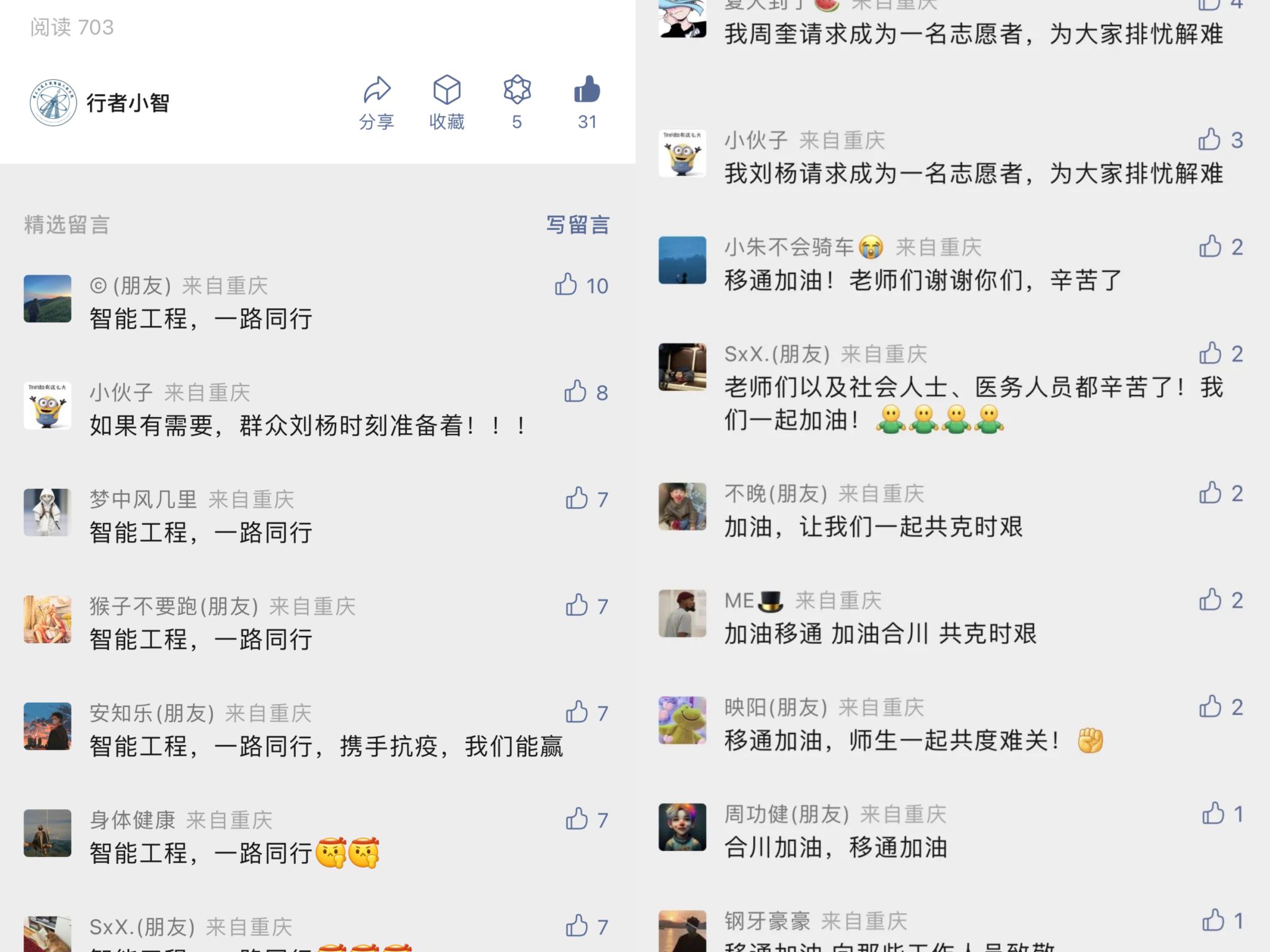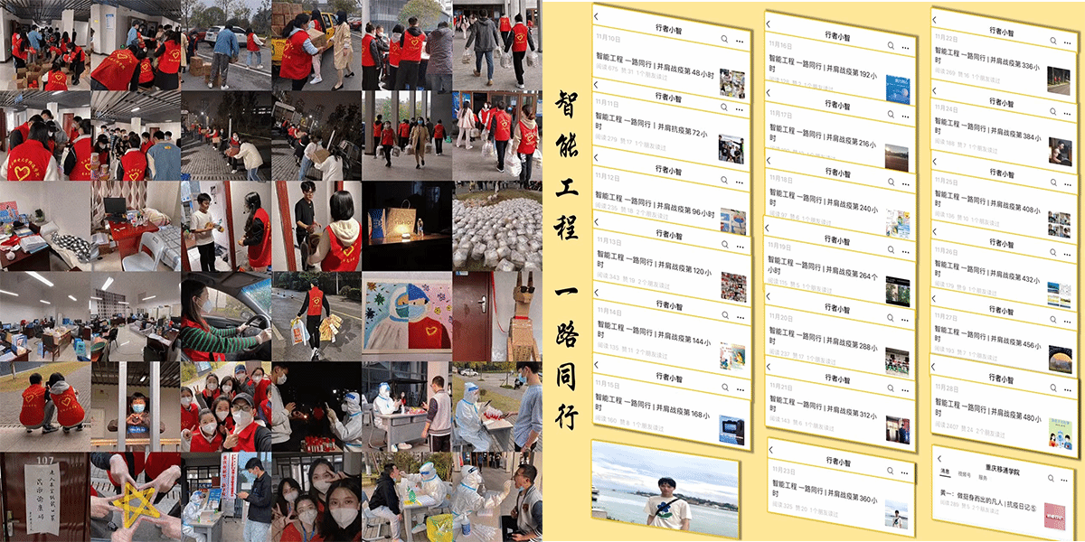 值得一提的是,在2022年疫情期间,“行者小智”将《智能工程,一路同行 | 并肩战疫的第xxx个小时》从第0小时做起,一直做到480小时,并几乎保持日更状态,20多个日夜,凝聚的恰恰就是每个人对“行者小智”的热爱寄托,以及期盼通过平台账号,给奋斗在一线的医护工作人员以及老师们报以感恩,给在封寝、封楼、封校的同学们带去别样的快乐与感动。