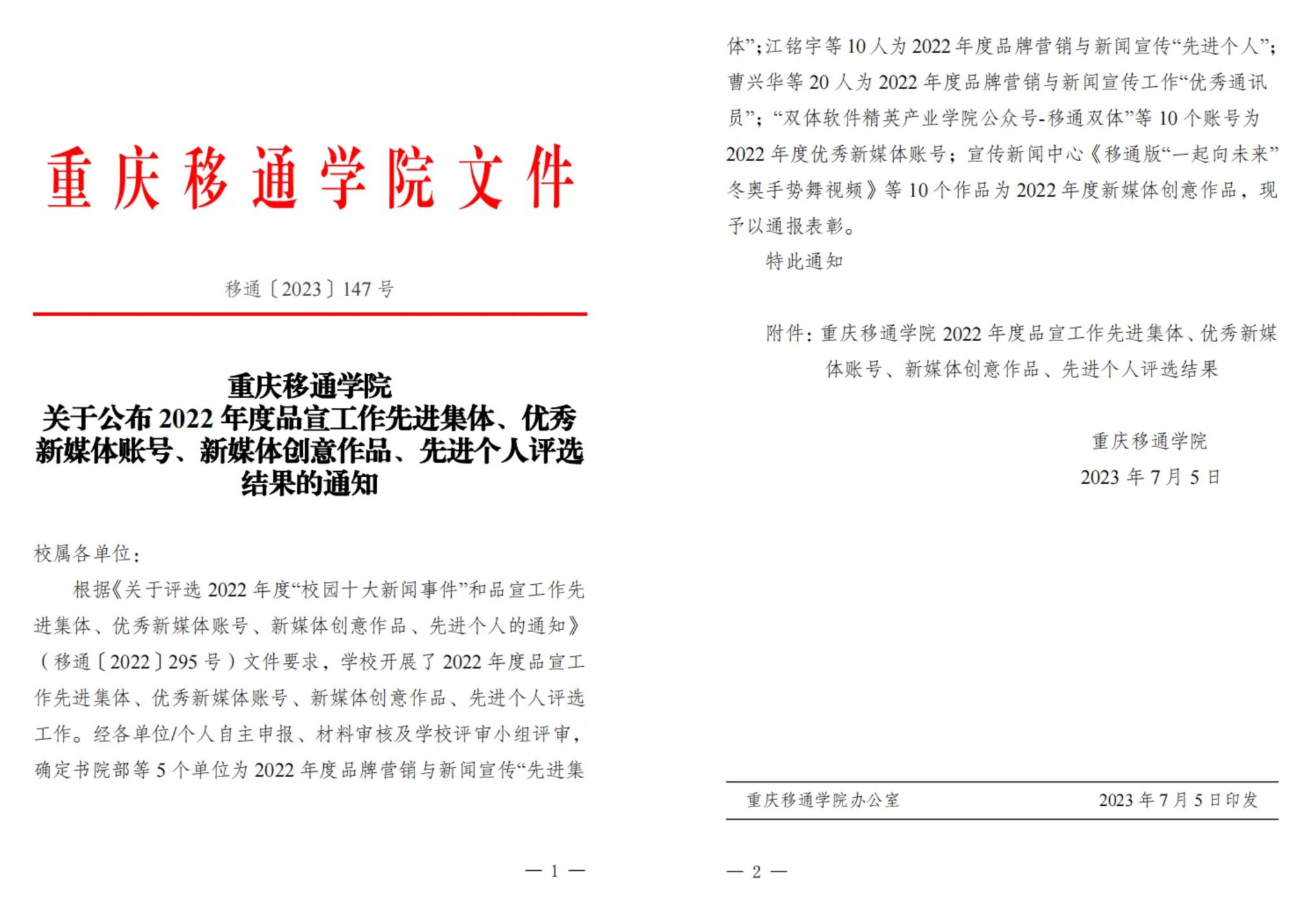荣获重庆移通学院2022年度“优秀新媒体账号”