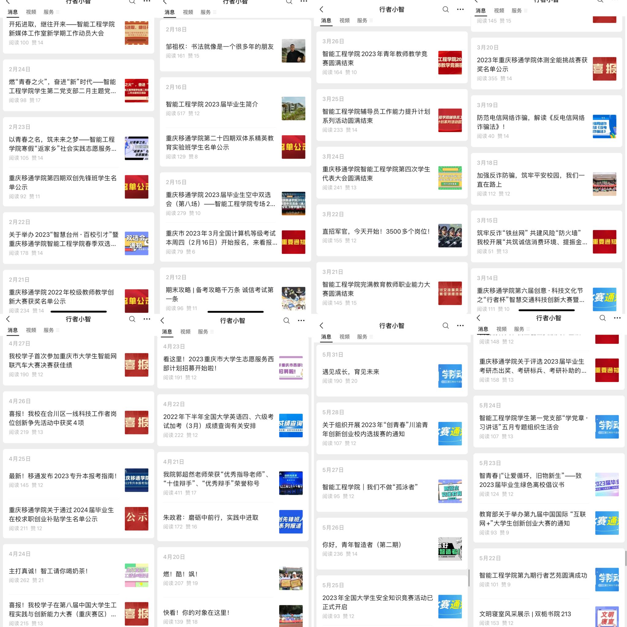 官方微信公众号“行者小智”2022年度以来,一直保持稳定的账号更新频率,基本维持每日一更,保证账号持续活跃,同时更新内容丰富全面,积极向上,贴合校园学院师生生活,同时做到新闻事件及时更新,“行者小智”运营团队的成员深知,新闻工作以高质量、高效率为前提,时效性一直是衡量其的一个重要性标尺,同时也是微信公众号平台的独特生命力所在。因此团队成员随时做好发布文章的充分准备,保证平台的新闻时效性。