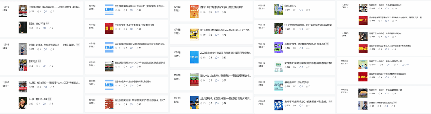 与上年度侧重点有所不同,2022年度,“行者小智”微信公众号平台精准定位,将一部分侧重点放在深抓有关党团工作、学生工作、教学工作、学科竞赛上。党团活动的实时跟进更是进一步优化组织设置,扩大组织覆盖,创新活动方式,增强智能工程学院团员青年的生机活力,建设高素质的基层团组;竞赛推送以及各项成果让同学们在竞赛中对专业知识学以致用,让同学们在大学学业生涯中更加警惕认真,同时也侧面展示我校以及我院竞赛风采;学生工作上特色推文的发布无限拉近了辅导员老师与学生们的距离,打造了我院辅导员老师们与同学们更为独特的交流平台。