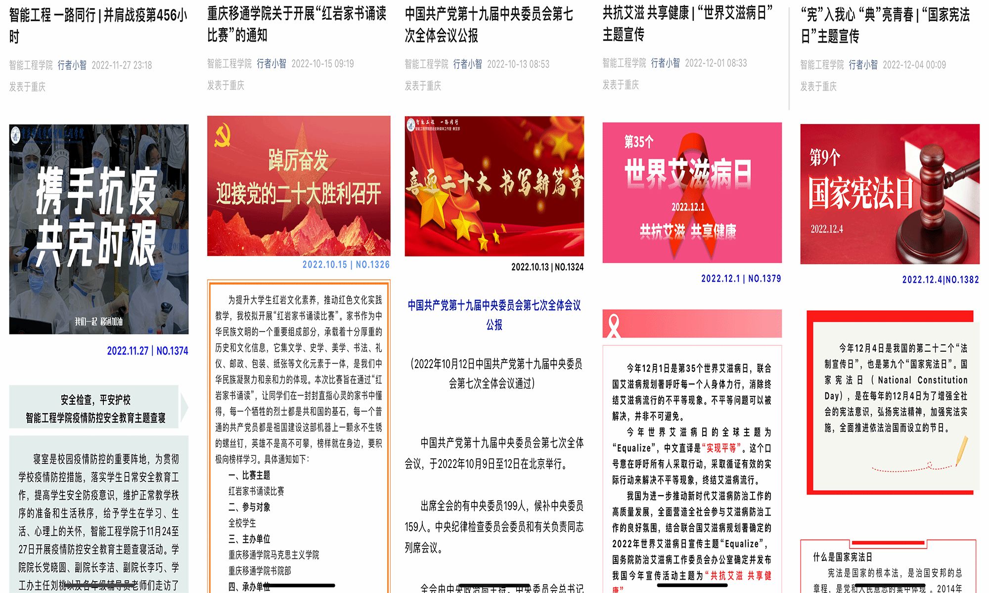 2022年度,智能工程学院官方微信公众号“行者小智”严格按照《重庆移通学院校园新媒体管理办法》要求开展账号各项运营工作,及时更新备案信息,严格落实三审三校。在三审三校方面,我院坚持四个原则,一是坚持正确舆论导向,弘扬主旋律,传播正能量,有效引导社会舆论,自觉抵制各类有害和虚假信息的传播;二是严格执行“三审三校”制度,确保信息报道真实、全面、客观、公正;三是进一步完善内容审核把关制度,明确审核把关重点和细节;四是进一步贯彻落实意识形态工作责任制。