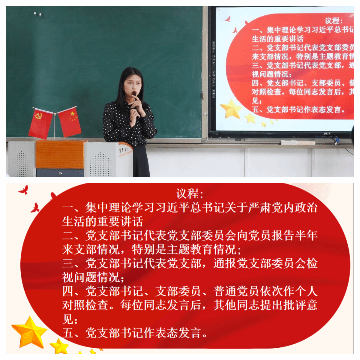 会议第一项议程:报告半年来党支部工作情况。学生支部书记谭英姿同志向全体党员同志报告了支部主题教育情况,并强调支部应当坚持“点线面”结合理论学习推动主题教育走深走实的路径。开展主题教育、教育整顿,关键都在于学深悟透习近平新时代中国特色社会主义思想。对主题教育情况要针对查找出的问题,剖析原因,制定整改措施,认真抓好落实,要善于发现问题、研究问题、解决问题。