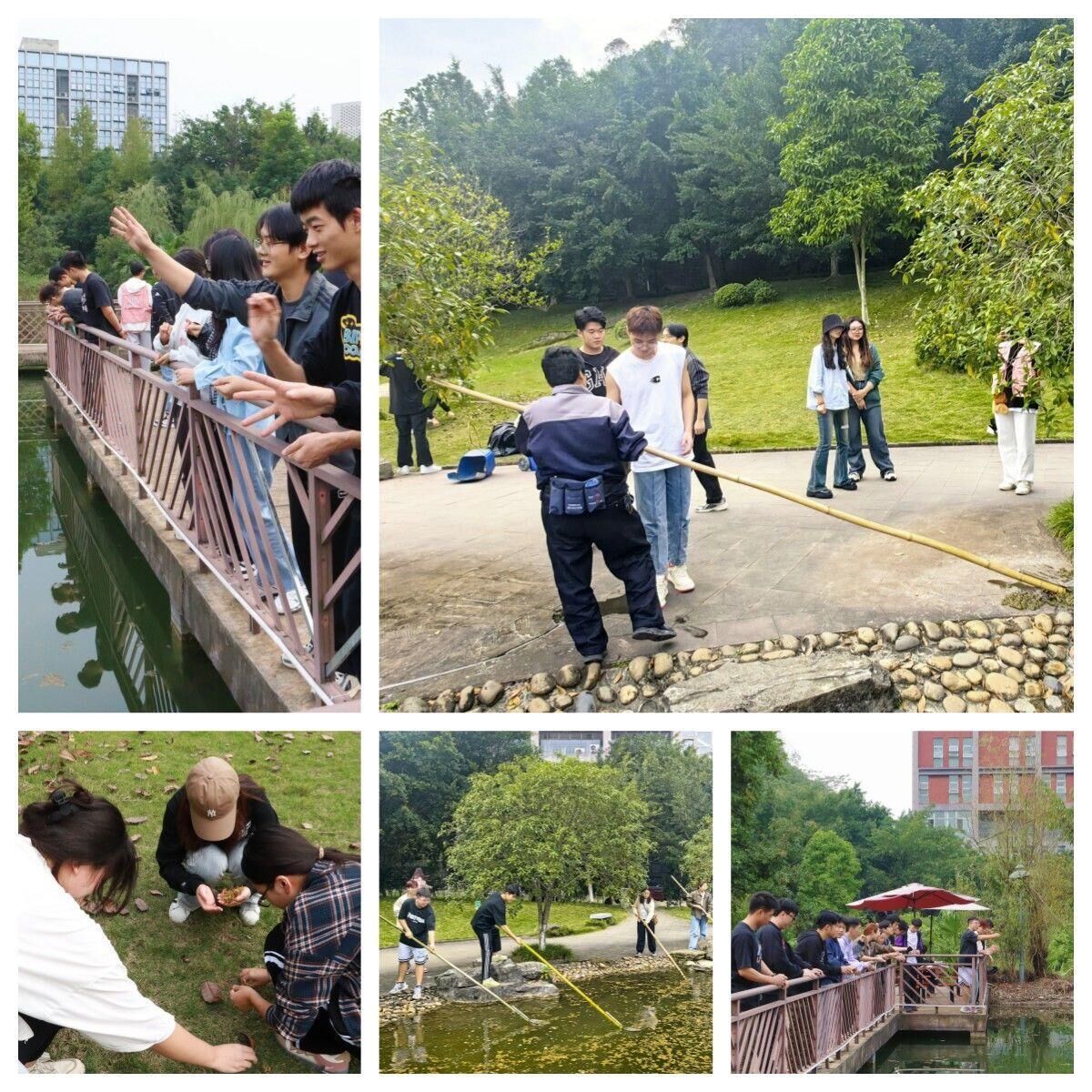 后勤处师傅为同学们详细讲解了本次劳动实践的技巧与注意事项,在后勤处师傅的带领下同学们分成三组分别前往双子湖畔、双子湖草坪进行浮漂打捞、锦鲤投喂、拔杂草等劳动实践。同学们三三两两弯腰徒手清理杂草,抑或在师傅指导下拿着工具打捞浮漂,同学们用亲身劳动还美丽、整洁的校园环境。同时同学们也积极参与、感受后勤处师傅的工作日常,在后勤处师傅的带领下为双子湖的锦鲤进行饲料投喂,同学们用实际行动践行爱校、荣校,也在劳动教育中解锁大学生活的另一种打开方式。