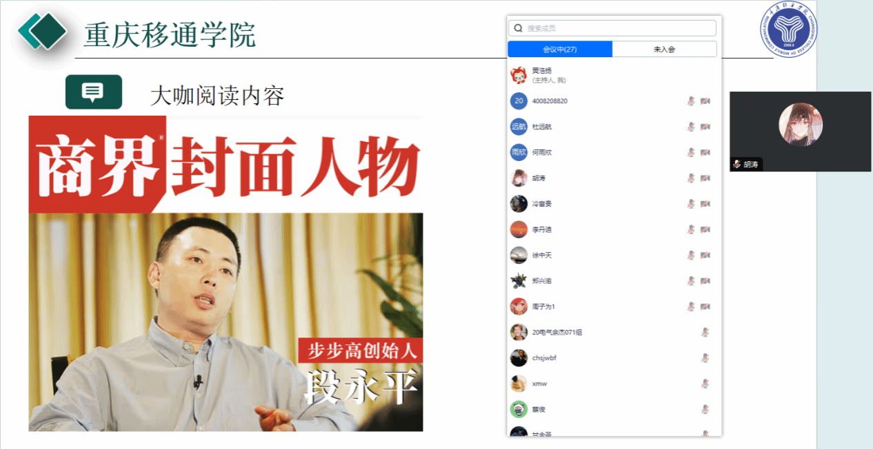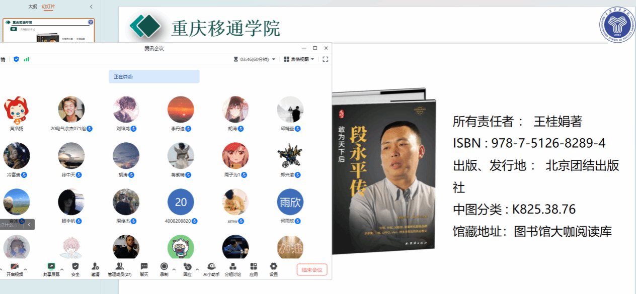 2024年1月20日10:00,轨道交通教研室陈鹏老师,通过线上会议的形式组织2023级轨道交通信号与控制专升本3班的学生,开展了此次大咖阅读计划分享会。