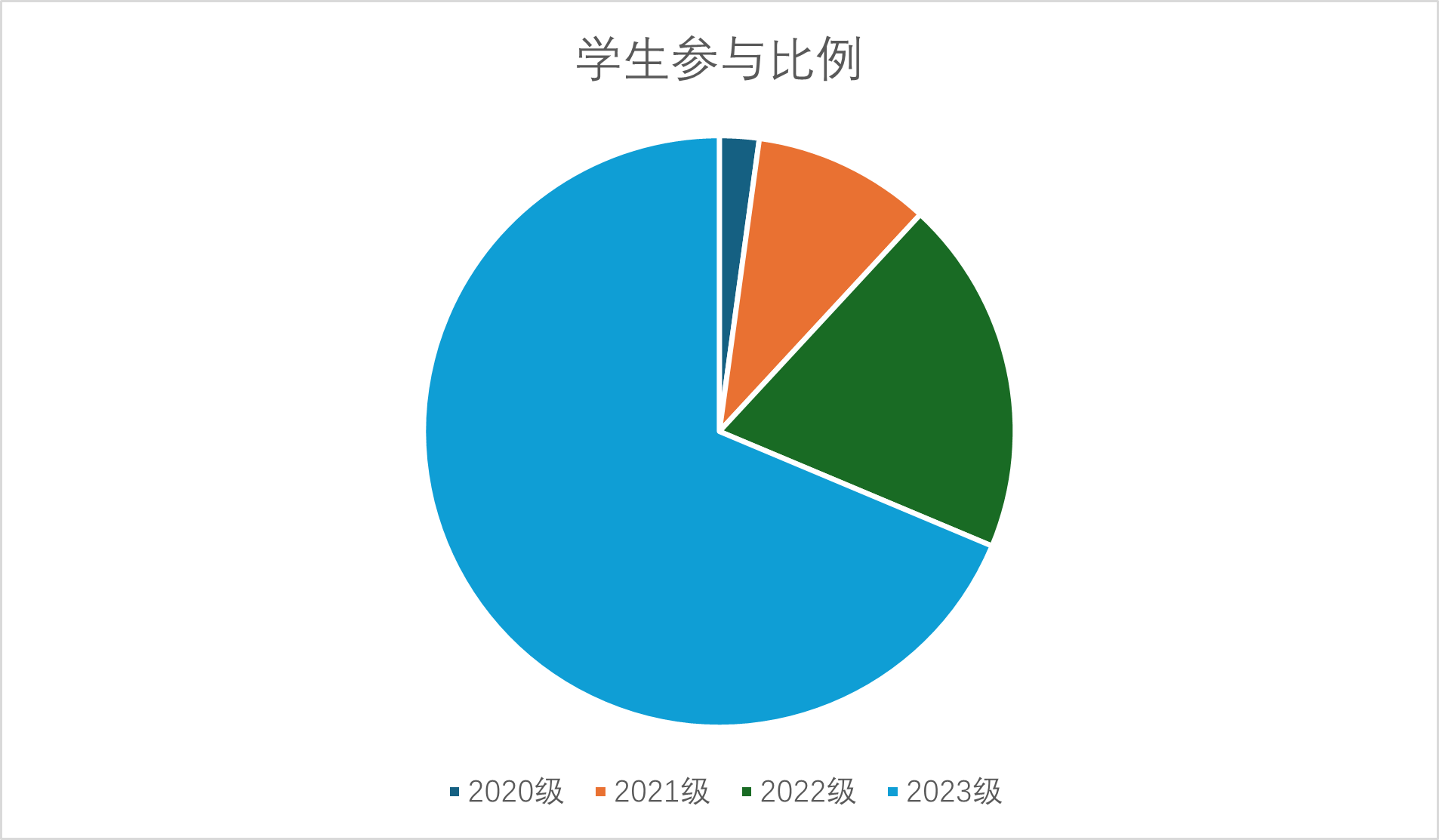 在参与此次活动的人员构成中,2023级的新生们表现尤为突出,成为了此次活动的中坚力量,占据了参与人数的绝大多数。紧随其后的是2022级的同学们,他们凭借着丰富的校园经验,为活动注入了不少活力。而2021级和2020级的学长学姐们也并未缺席,他们的积极参与为活动增添了更多色彩,具体如下图:
