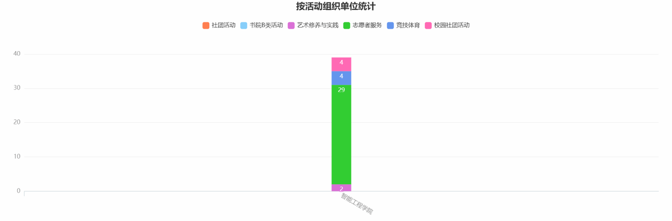 在春意盎然的3月,我们智能工程学院的学子们沐浴在完满教育的光辉之下,满怀激情地迎接新一轮的机遇与挑战。随着时光的流转,我们的数据分析也如同春日的嫩芽般生机勃勃,不断更新。在这一个月里,我们精心策划并推出了多达39场精彩纷呈的活动,其中涵盖了校园社团的4场盛会,艺术修养与实践的2场,志愿者服务的29次暖心行动,以及竞技体育的4场。这些活动如同绚烂的烟花,点亮了我们的校园生活,吸引了约1772人次的同学热情参与。