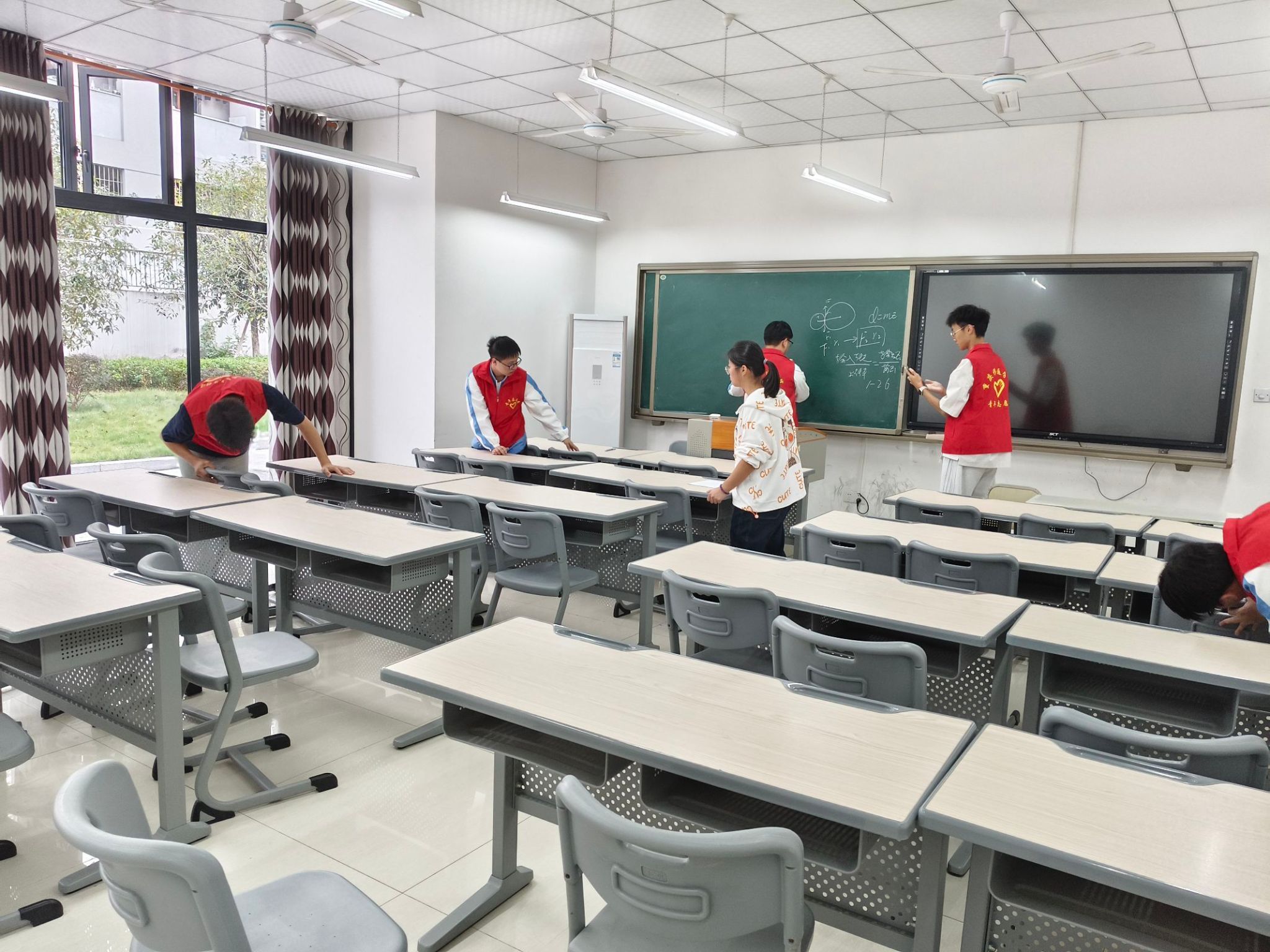 在清洁过程中,志愿者们展现出良好的团队精神。一些人负责擦洗黑板,用黑板擦彻底清除粉笔痕迹;另一些人则忙着整理桌椅,确保每张桌子和椅子都整齐排列,为学生创造一个有序的学习环境。尽管天气微凉,但志愿者们的热情丝毫不减,他们干劲十足,团结协作,展现了智能工程学院青年志愿者积极向上的精神风貌。
