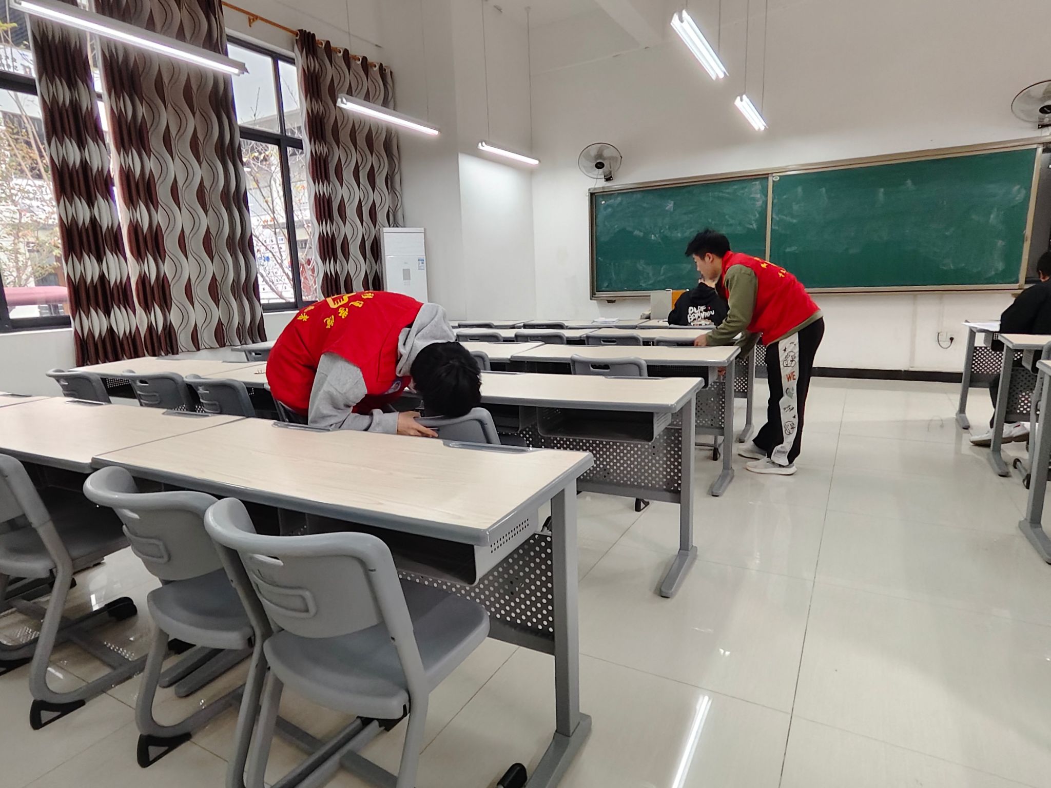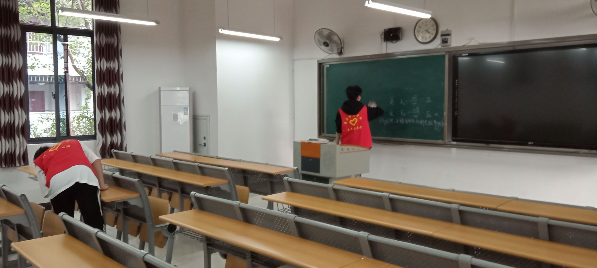 志愿者们似一缕阳光般,照亮教室的每一处角落,志愿者们穿梭在教室、办公室,所到的每一处都与从前不同,有垃圾的地方垃圾随之消失,没有的而是变得更加光鲜亮丽。此外,志愿者们也十分有条不紊,大家分工明确,动作迅速,有人在擦拭黑板上未褪去的知识,有人在打扫抽屉中遗留下来的垃圾,也有人在整理层次不齐的桌椅,大家都互相帮助,团结一致。在这次的打扫过程,志愿者也未曾表现出怕苦与怕累的行为与语言,志愿者们的种种行为带给他们的不只有汗水和劳累,而是带来更多的满足感以及对于保护校园环境的成就感。
