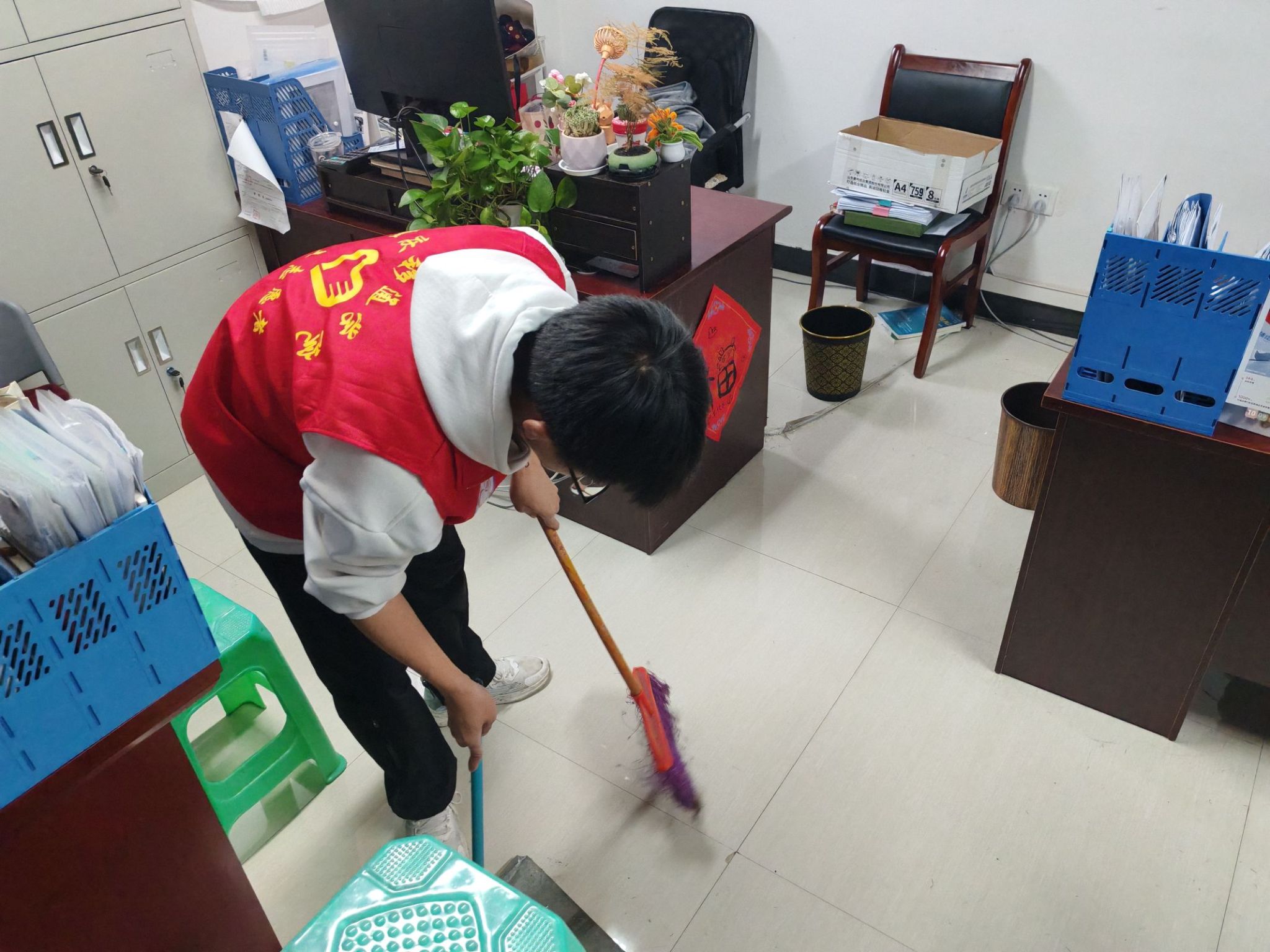 志愿活动伊始,智工青协实践部部长对支队队员们分配了任务,分工明确的让大家参与到活动中去,并要求同学们高效率的开展四个书院的清扫活动。活动期间,在充满书卷香的书院中,志愿者们认真地清扫楼梯上的纸屑、塑料瓶,哪怕是隐藏在课桌深处的微小垃圾,也被他们灵敏的目光发现并清理干净,并将散乱的书桌排列整齐,为同学们创造出更舒适的学习环境。即使在寒冷的天气下,志愿者们任然充满热情的去完成每一项打扫任务。