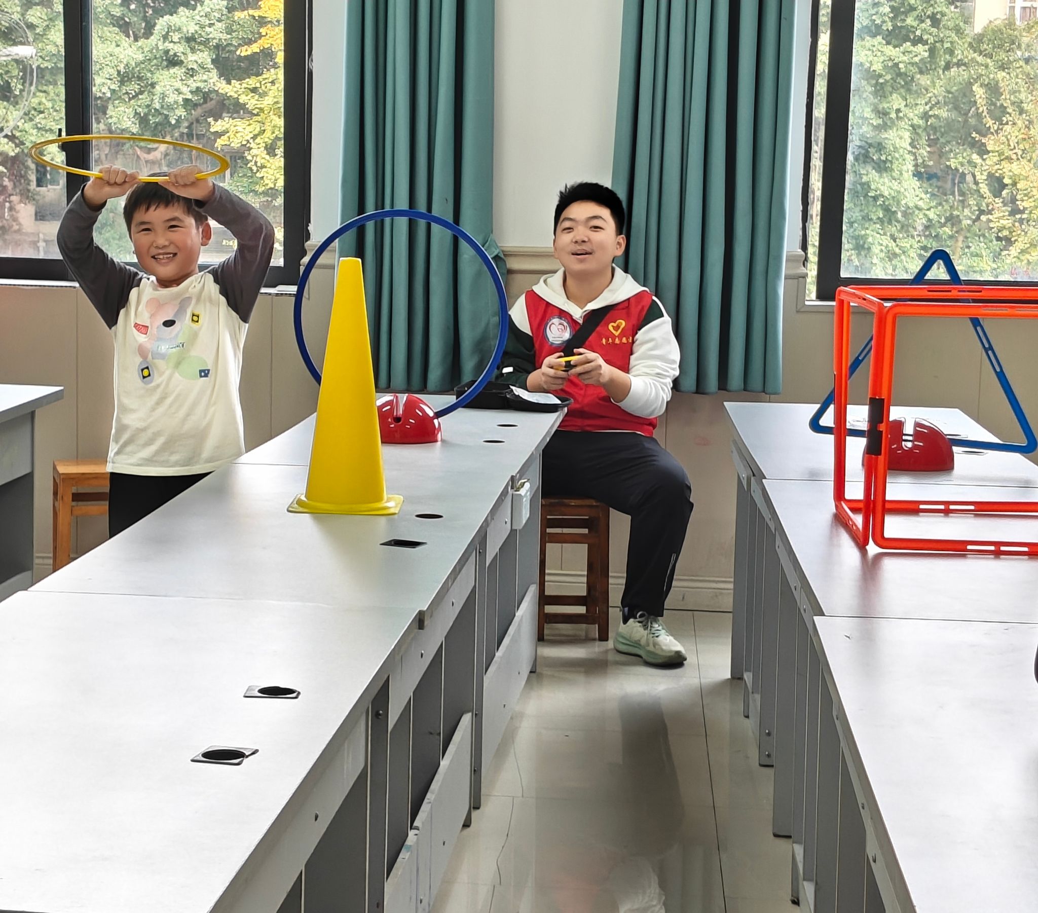 在四旋翼无人机的指导中,支队员们针对小朋友的无人机学习情况对其进行分别教学,在支队员们的悉心指导下,小朋友们开始尝试亲自操控无人机,在不断的练习中逐渐掌握了窍门,让无人机能够穿越简单的障碍物。教导小朋友飞无人机的活动,不仅让小朋友门近距离接触到了先进的科技产品,更极大地锻炼了他们地手眼协调能力和专注力,为小朋友们开启了一扇探索科技世界的趣味之门。