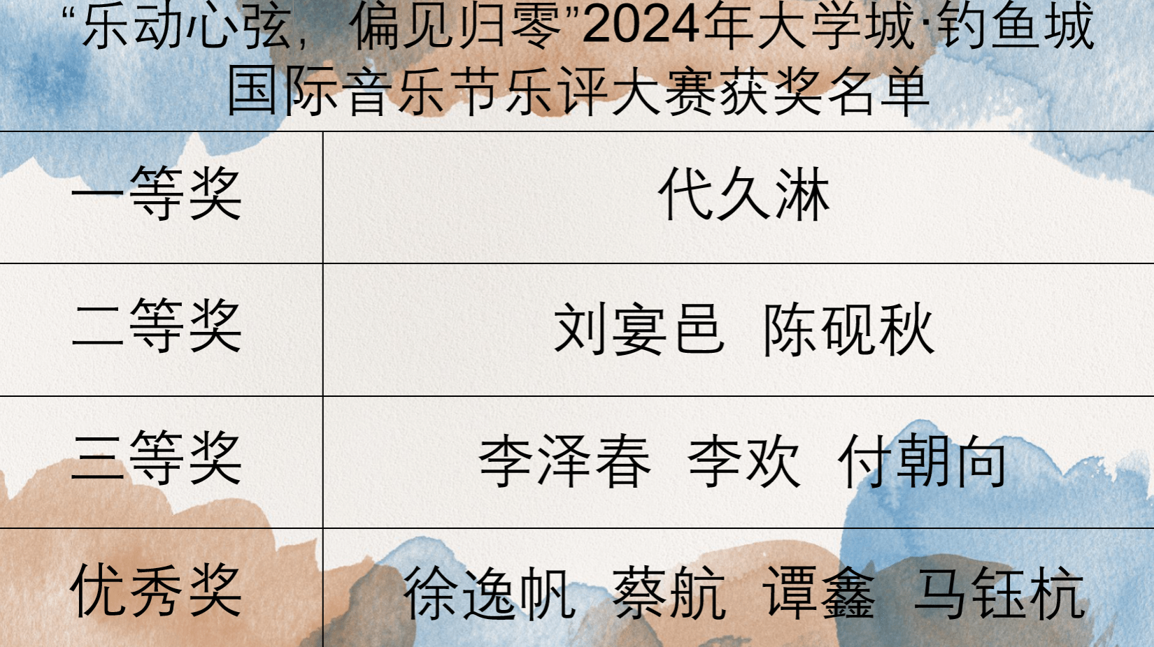 本次“乐动心弦,偏见归零”2024年大学城·钓鱼城国际音乐节乐评大赛获奖名单如下: