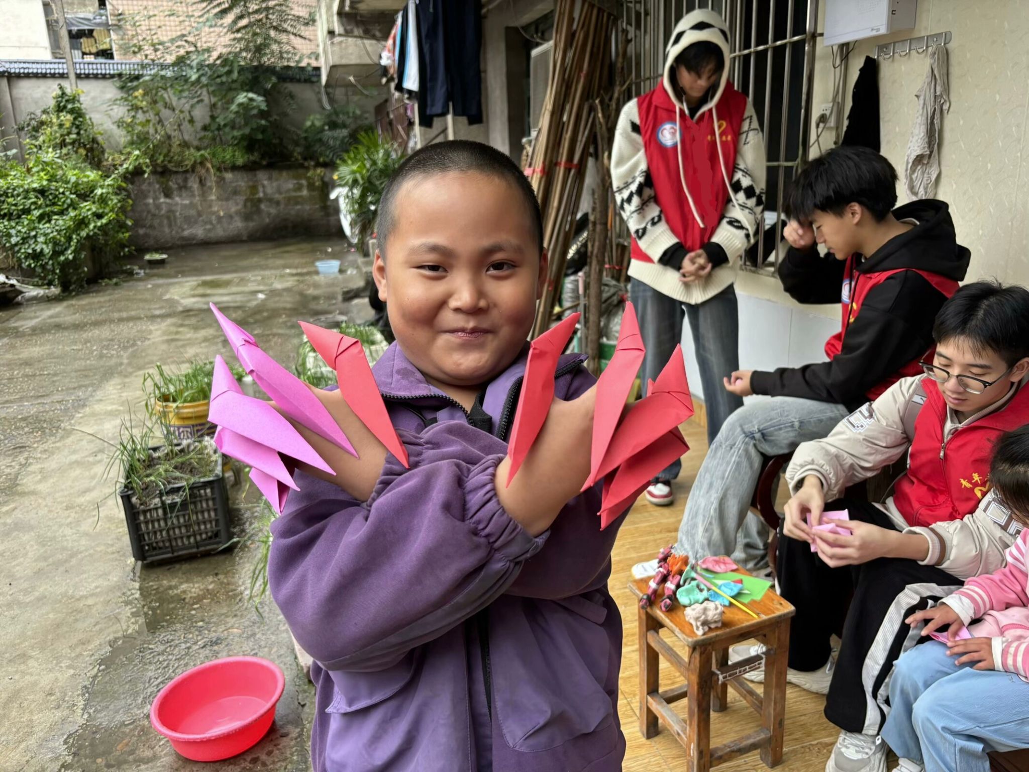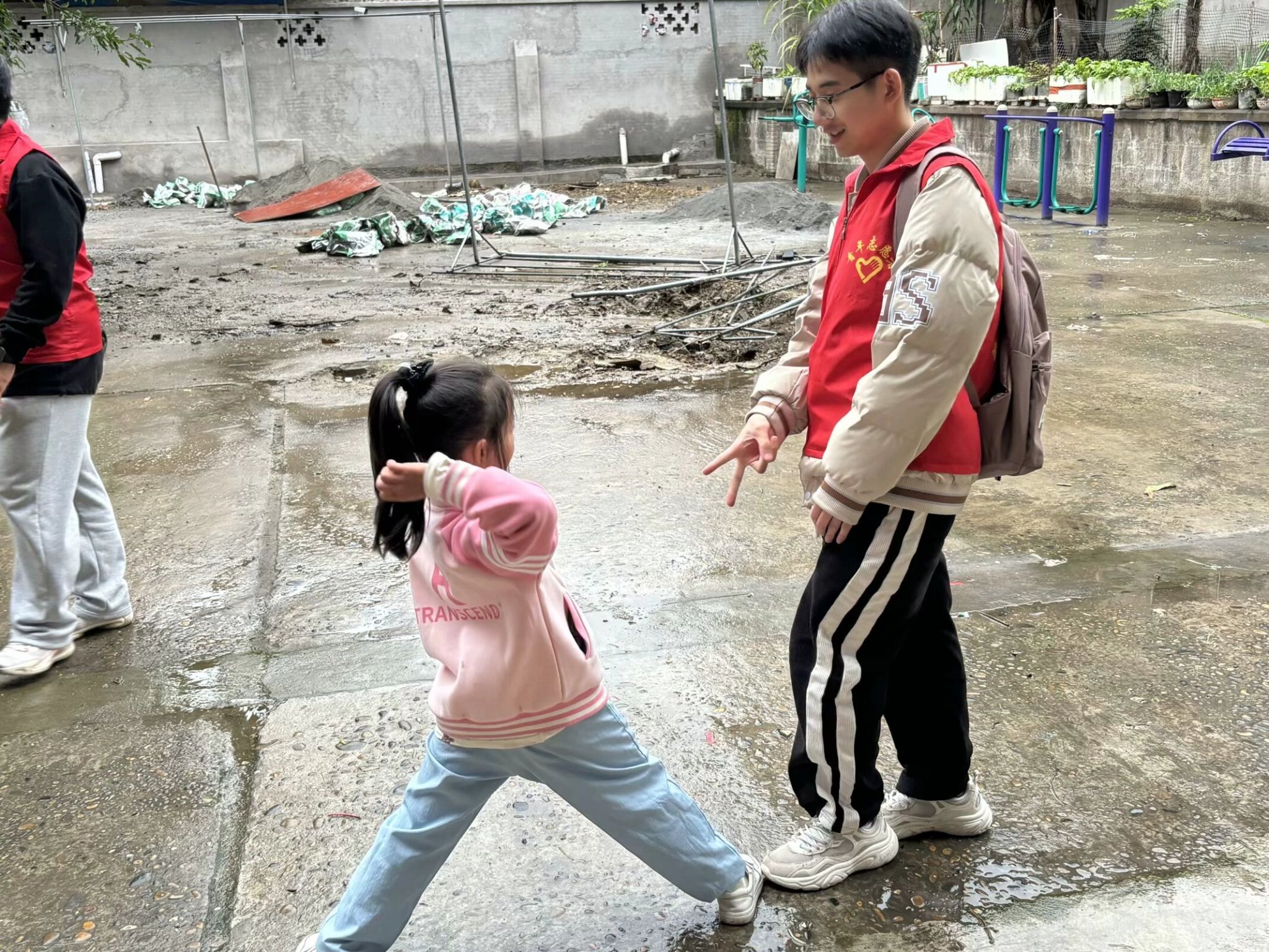 活动期间,尽管天气下着雨,但在支队长、队员以及小区居民的多方努力下,志愿者们找到了安全合适的地点一对一的对小朋友们进行帮扶,让每位“折翼”天使都得到志愿者们的关爱。为增加活动的趣味性,志愿者们带来了橡皮泥、折纸、毽子等游戏道具,并充分利用他们与孩子们玩到一起,整个活动期间都充满着欢声笑语。