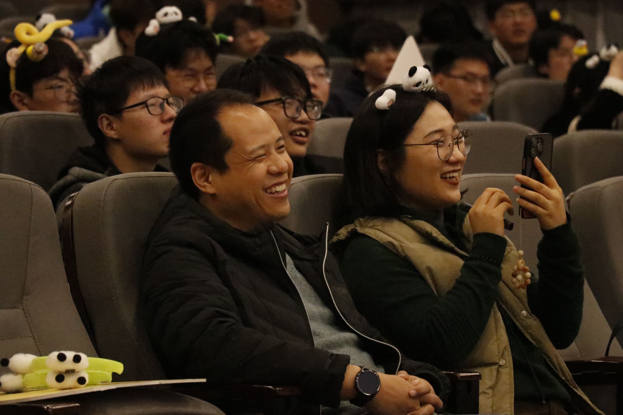 紧接着的互动环节依旧令人激动。“音乐碰撞”、“艺术问答”三个互动环节将现场氛围烘托到高潮,在舞蹈模仿环节,特此我们邀请到了衣米然·奴尔老师,请衣米然·奴尔老师上台,同学们上台配合衣米然·奴尔老师完成一系列舞蹈动作。台下观众们争先恐后的参与,使剧场的氛围达到高潮和升华,这时候艺术间心与心的交流碰撞出明亮的火花。