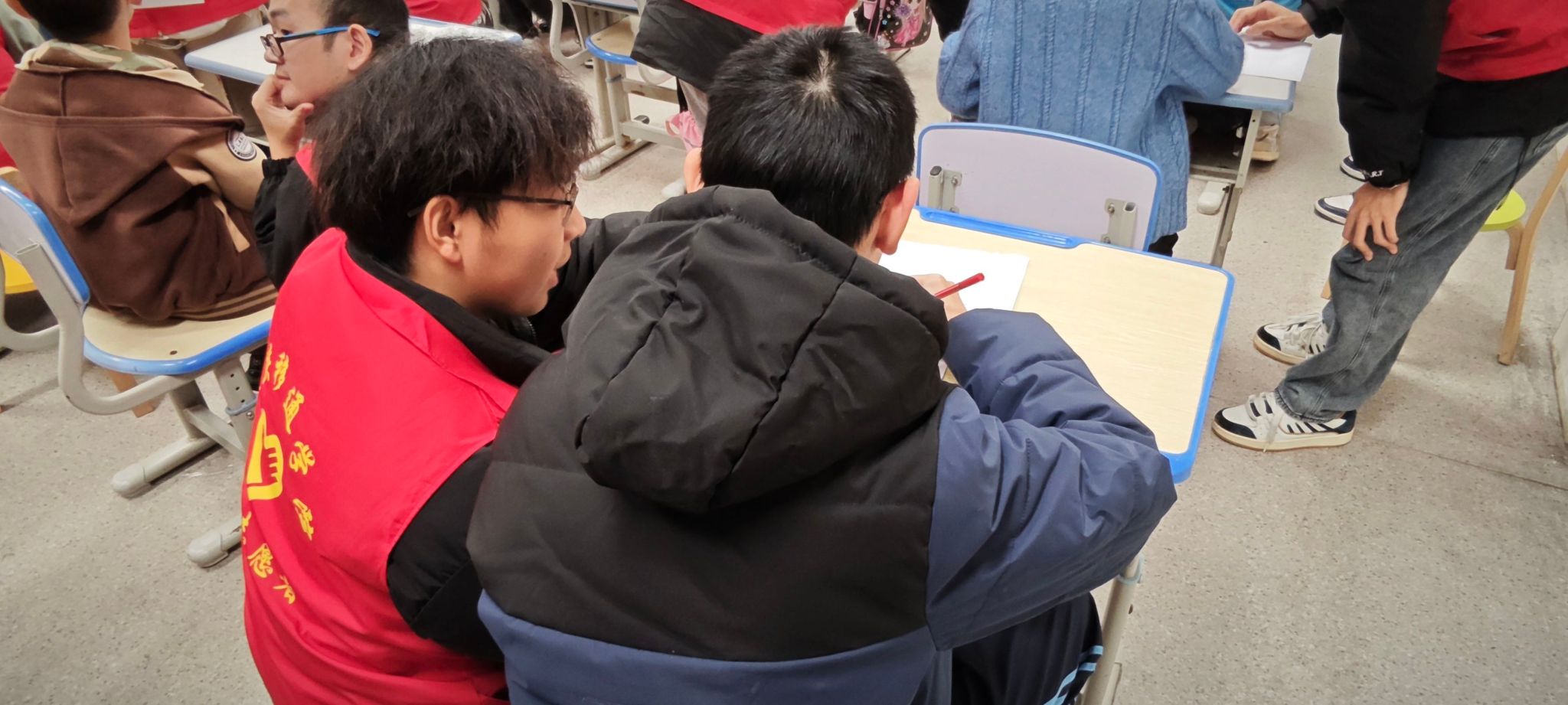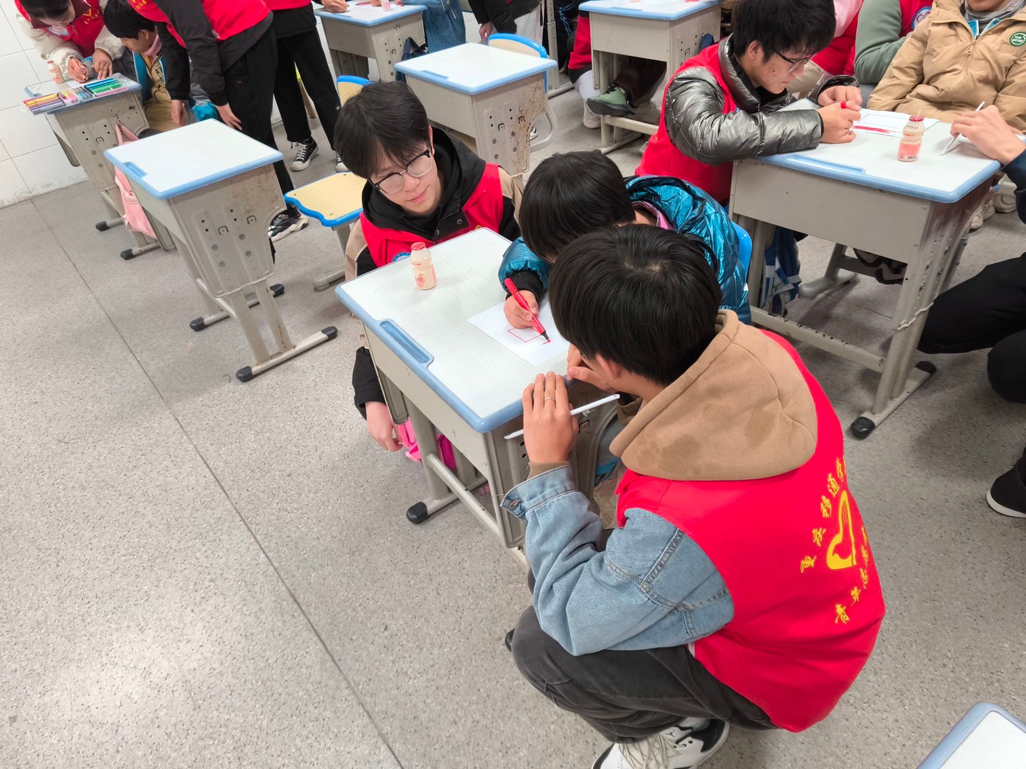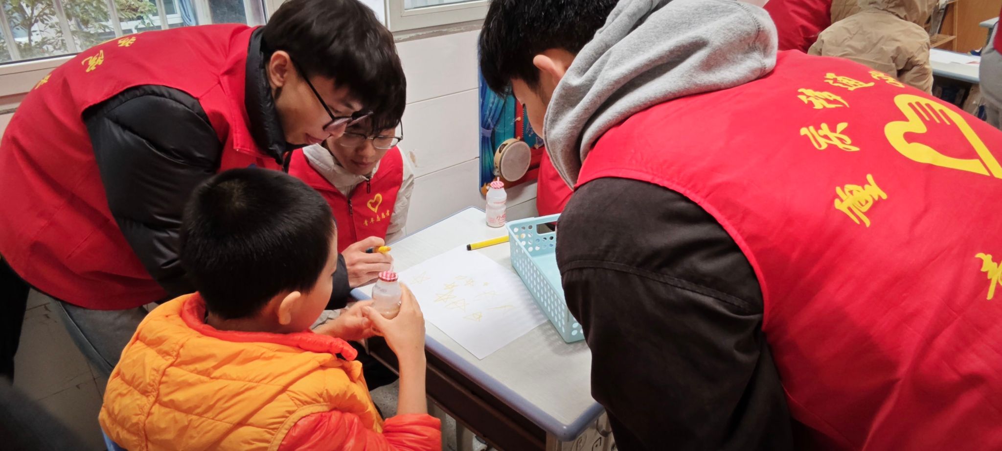 接着,志愿者们带领着小朋友们开始了五星红旗的画画和制作,志愿者们先示范如何裁剪红色卡纸,如何画五角星,小朋友们纷纷拿起小剪刀,在志愿者的耐心辅助下,小心翼翼地裁剪着,尽管他们的动作略显笨拙,但那份认真令人动容。在画五角星环节,志愿者们向孩子们展示了五角星的位置布局,并手把手教他们如何将五角星形状画在旗面上。有的孩子手部协调性欠佳,志愿者就握着他们的小手,一点点完成画画动作,确保每颗五角星都端正地位于旗面上。另外,志愿者们也用与众不同的方式鼓励孩子们放下自卑的心理包袱,变得活泼,自信,同时要常有感恩情怀和励志精神,以便更好地融入集体生活。