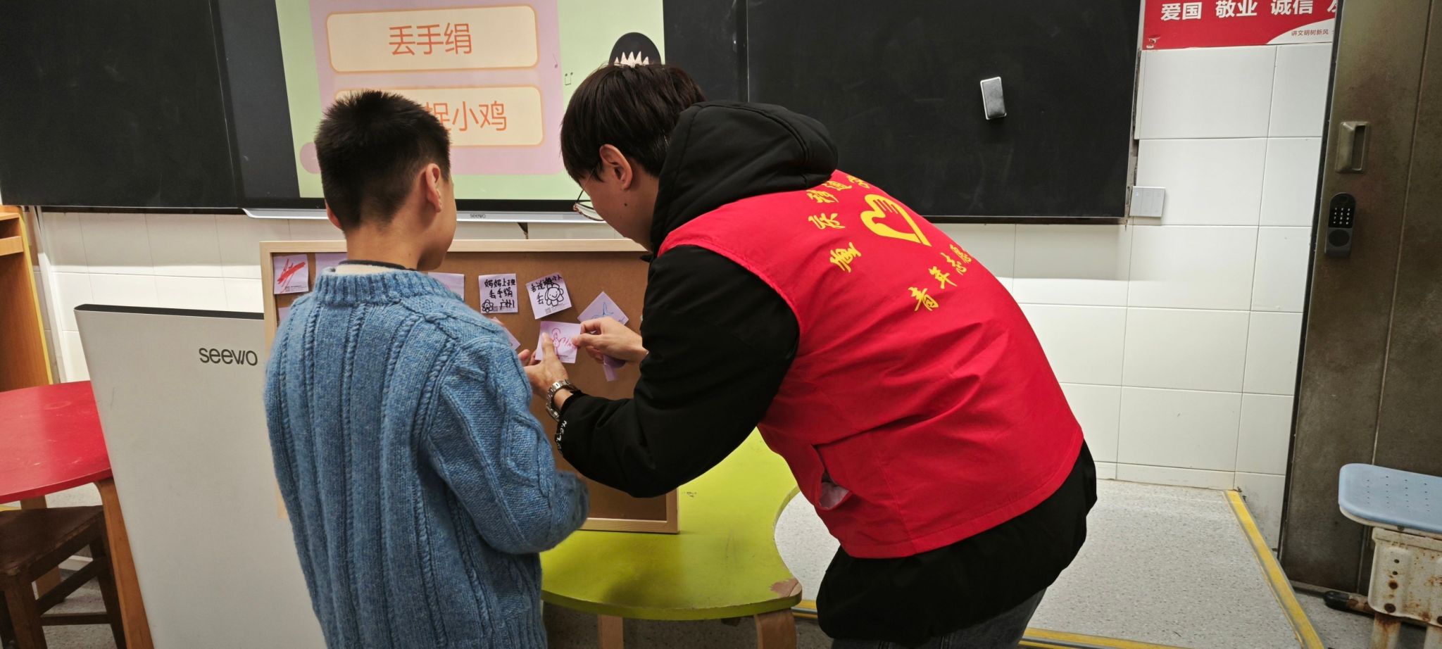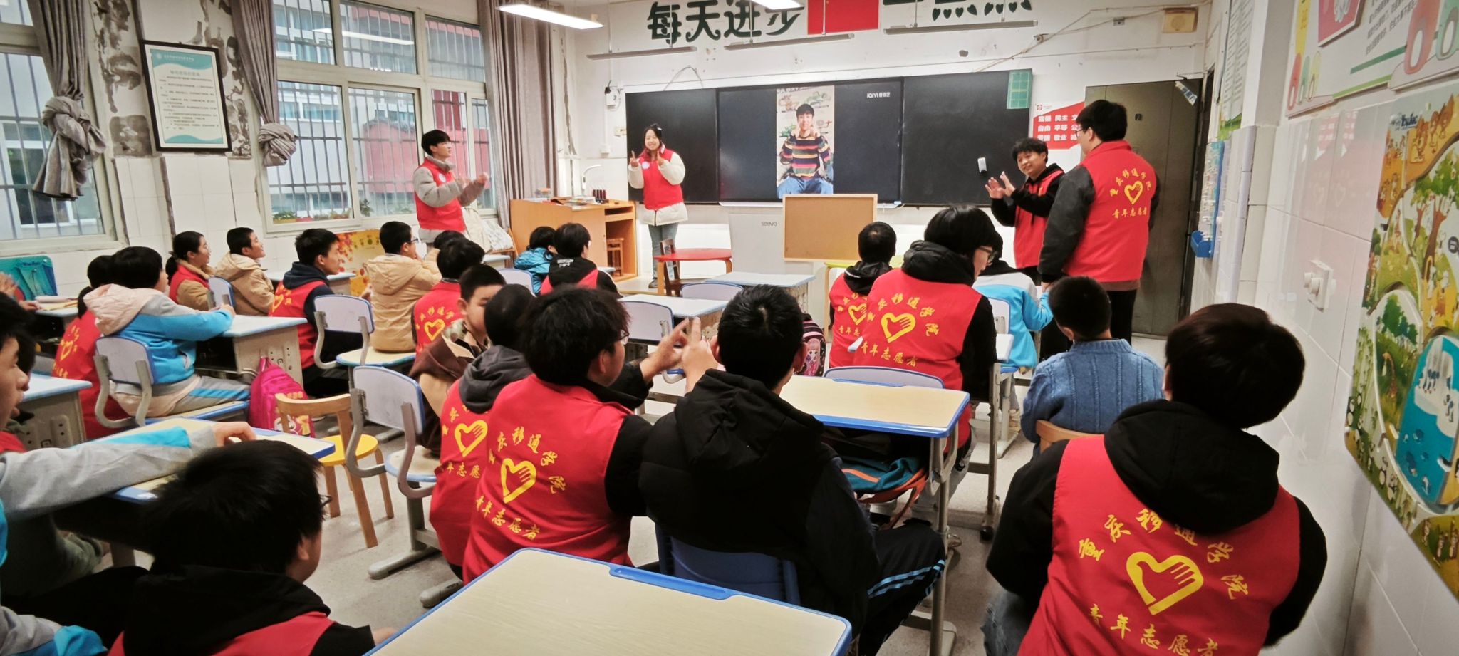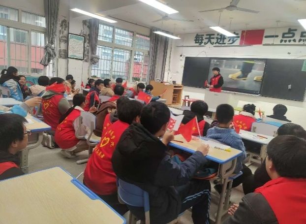 在抵达活动地点后,负责的同学就活动的注意事项进行了讲解。随后,在特殊教育学校老师的指引下,志愿者们就开始陆续开展本次志愿服务活动。活动伊始,志愿者们带领着小朋友们一起唱歌,以此拉近彼此之间的距离,并用简单易懂的语言和生动的图片、视频,向特殊儿童们介绍了国旗的含义、特征以及它所代表的伟大意义。孩子们虽然认知能力有限,但他们清澈的眼睛里充满了好奇与专注,认真聆听着每一个字。