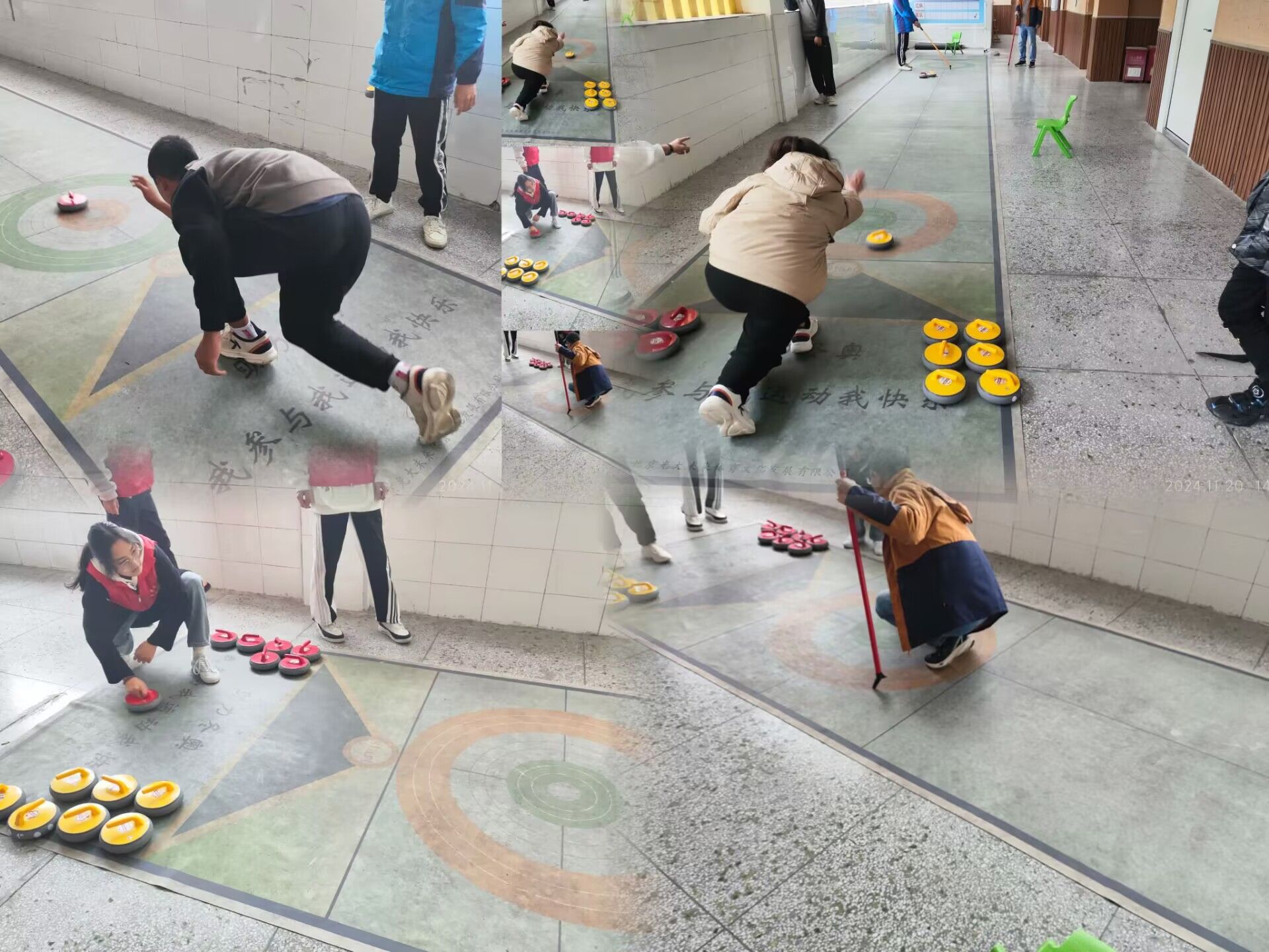 在“陆地冰球”活动,志愿者这次作为小朋友们的对手每轮上一个人进行对战,看起来像是运气游戏,实际上像力气游戏,对面小朋友力大球飞。全部击中了志愿者的球