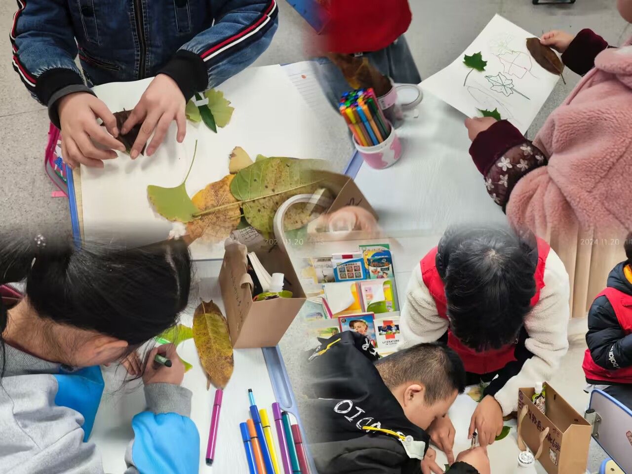在 “拾秋” 活动里,大家一起寻找或准备代表秋天的树叶树枝,用胶水粘贴成各种简单而富有创意的图案,锻炼了孩子们的动手能力与想象力。