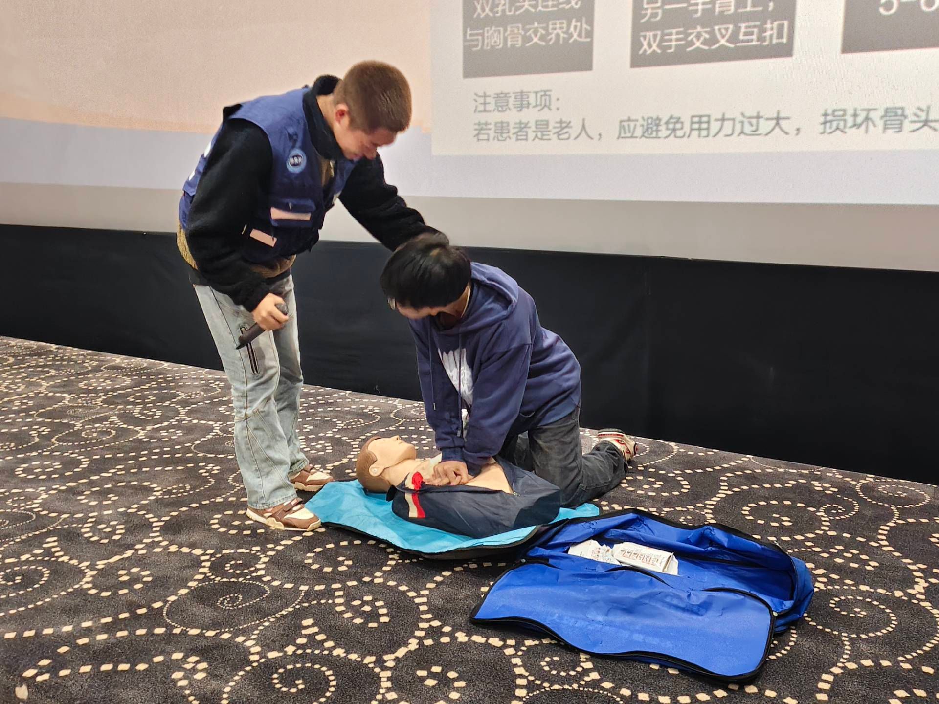 活动伊始,专业蓝天应急救助支队人员携带模拟人教具、急救设备登场,他们有着丰富的急救与教学经验。指导老师也登临现场,借数据展现我国院外心脏骤停生存率偏低现状,点明心肺复苏普及紧迫性,迅速攥紧听众心弦,点燃学习热情。