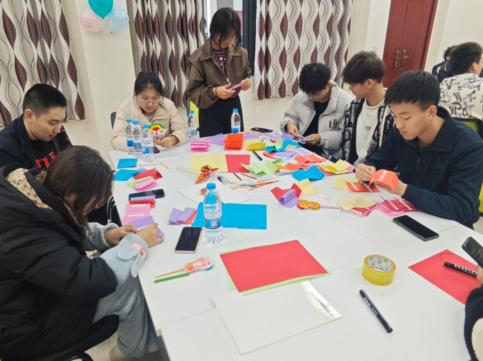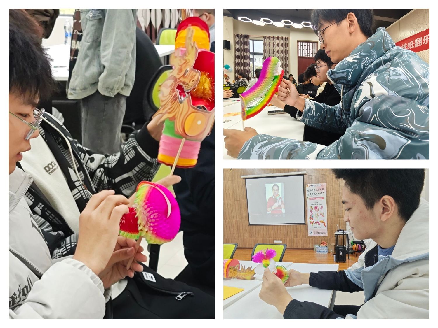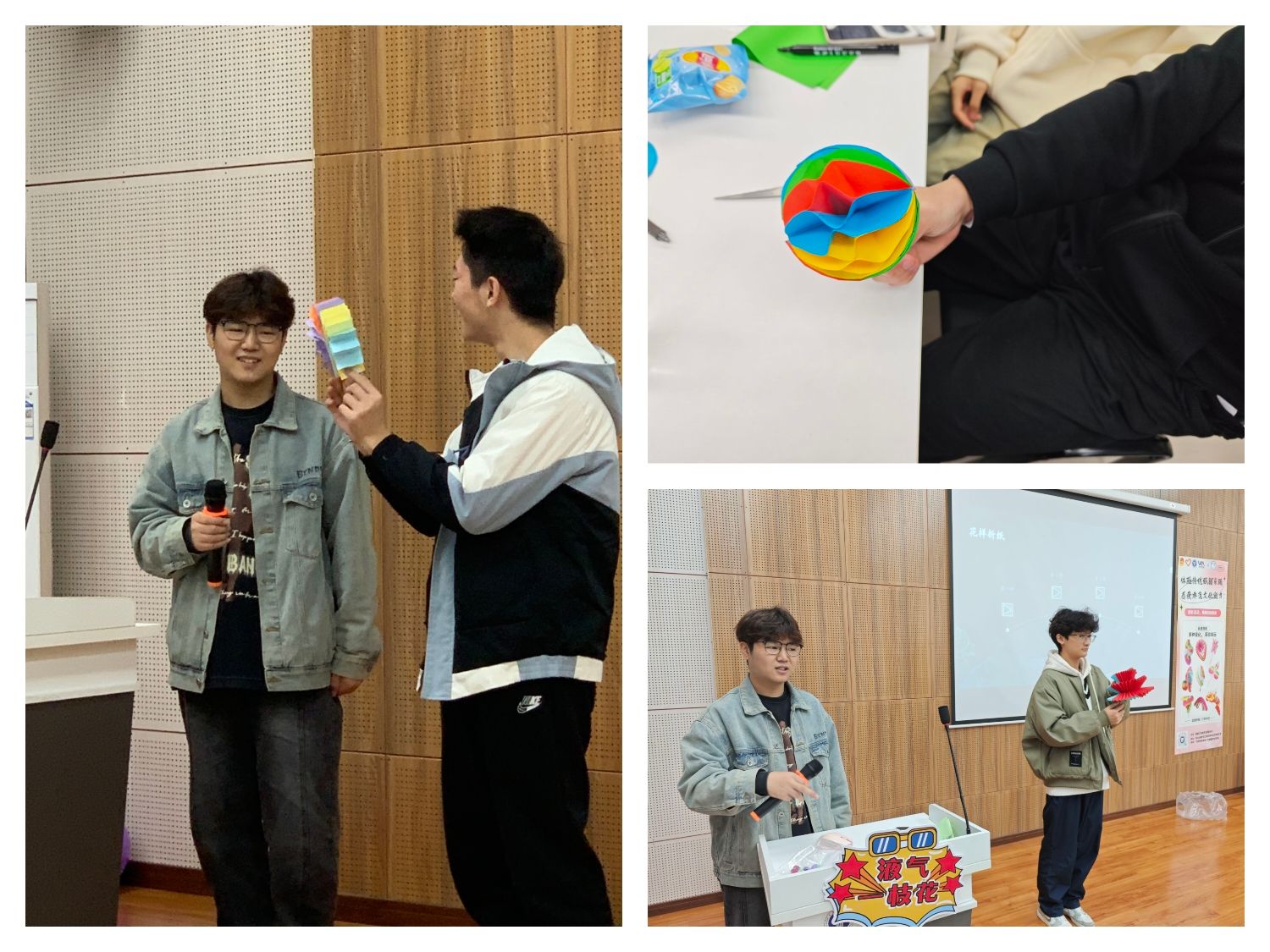 纸翻的翻、拉可谓是妙趣横生,纸翻在同学们指尖翻飞、拉拽,展现出一幅幅生动的画面。不仅如此,纸翻的剪、折也别具一番风味。活动现场,参与活动的同学组成团队,每位同学自行挑选材料、发挥创造力与想象力,通过折、剪、粘等精细步骤,一个个纸翻作品逐渐成形。最后,用棍子作为把柄,一件承载着对非物质文化遗产敬意与创新的纸翻作品产生。各小组纷纷上台展示他们的纸翻作品,并与在场同学交流分享创作灵感与心得。其中小组一分享到他们采取红蓝色调,翻折卡纸形成M型后多次堆叠,成品呈现为前红后蓝形状酷似三重楼的纸翻作品;而小组六分享到他们追求色彩缤纷,所以在卡纸颜色的选择上下了功夫,预期做出一个类似彩球形状的纸翻作品。这一环节不仅加深了同学们对非遗纸翻文化的认识与理解,更是让同学们在体验中切实体会到非遗纸翻的乐趣与承载的文化精神。