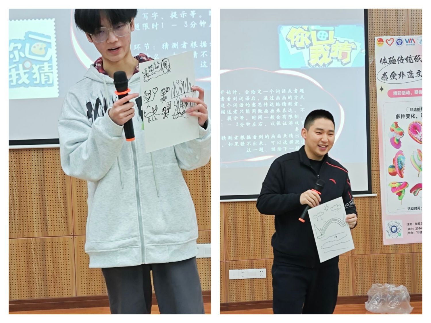 在轻松愉悦的氛围中,活动进入了趣味游戏环节。同学们参与了以非遗纸翻经典作品为主题的“你画我猜”和“萝卜蹲”等趣味游戏。在游戏“你画我猜”环节中,主持人以经典纸翻作品名来作为题目,参与游戏的同学在白色硬卡纸上发挥想象力、大胆落笔。这些绘画中有的简洁明了,有的生动形象。而猜测的同学们则大胆猜测,各抒己见。猜对的同学上台展示画作并解读画作,而猜错的同学则不甘示弱,也相继上台展示画作。接下来的“萝卜蹲”游戏更是将活动推向高潮,各小组配合默契,积极参与。通过这些游戏,同学们对纸翻经典作品有了更深刻的印象,也对非遗纸翻艺术有了更深入的了解。