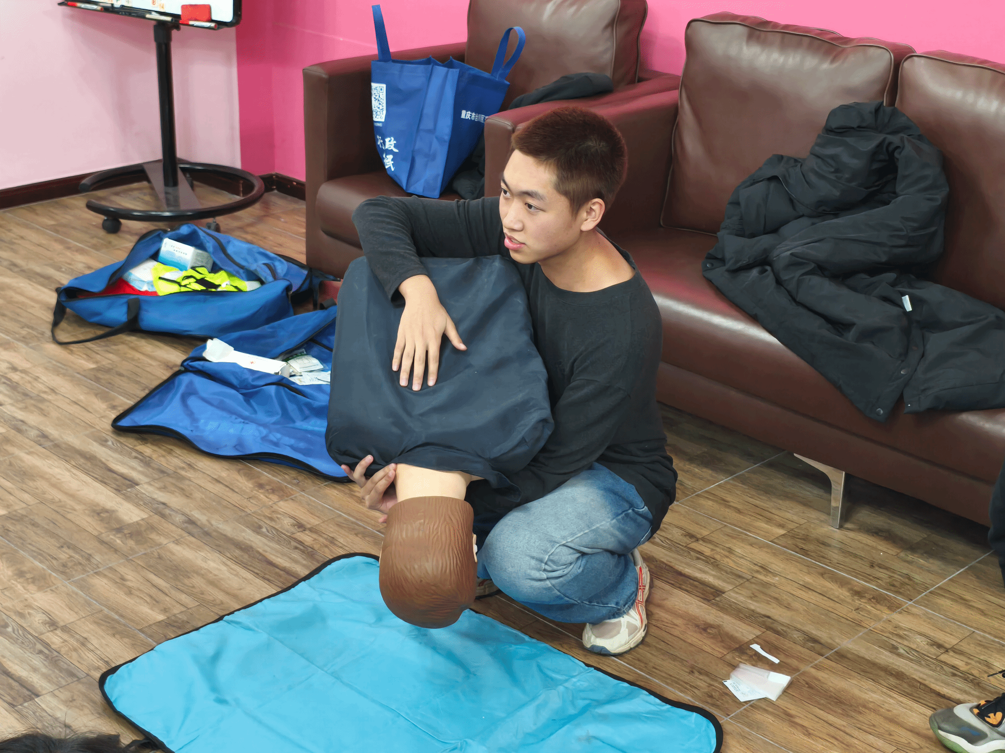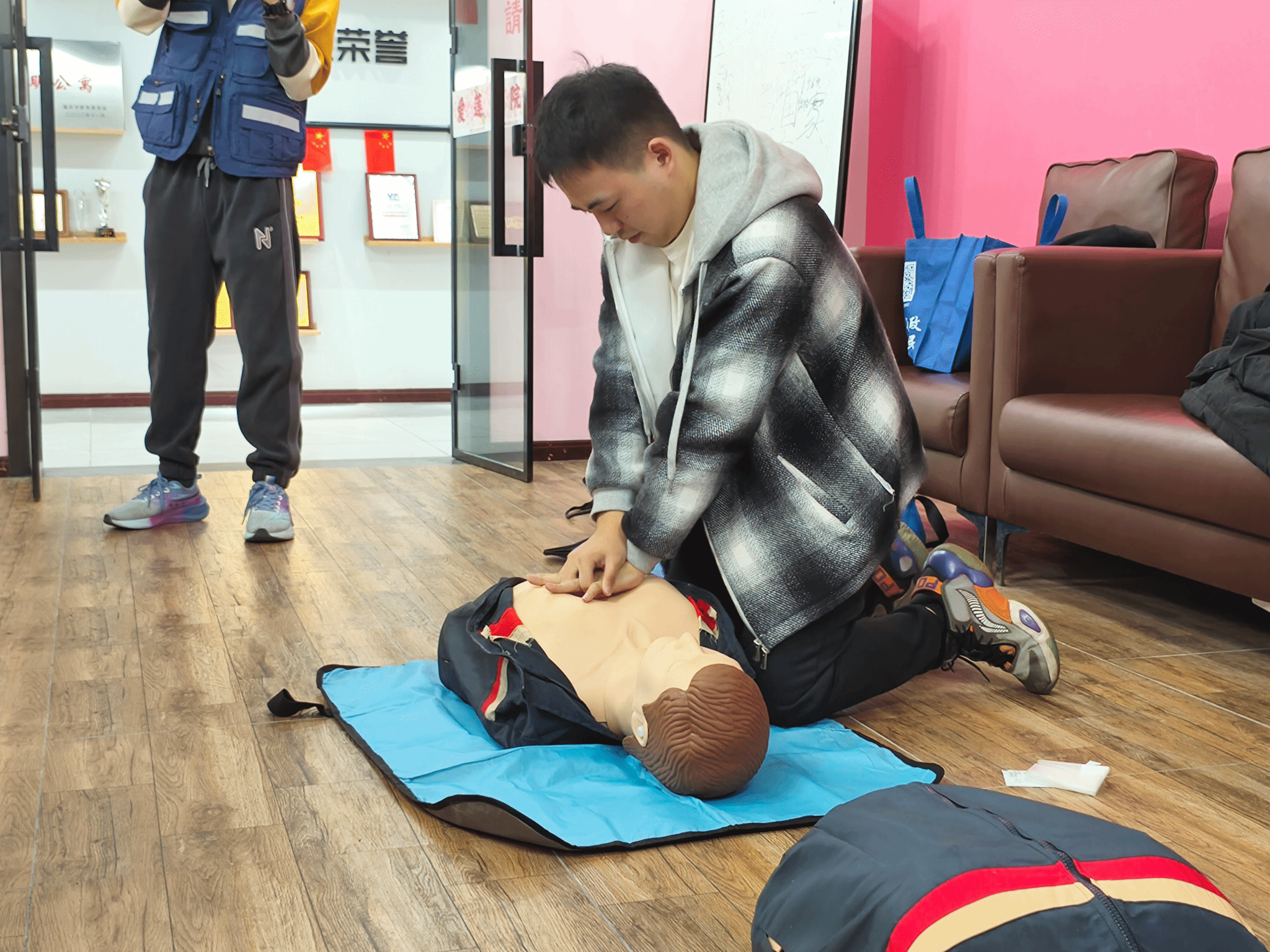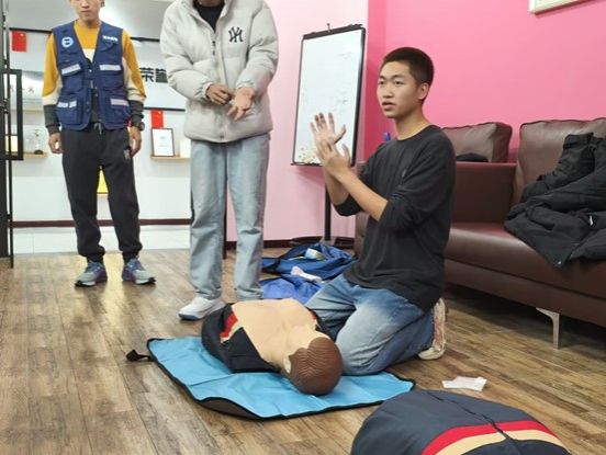 理论讲解过后,迎来了最为核心的实操示范环节。蓝天救援队成员借助专业的模拟人教具,在活动现场为同学们全方位、无死角地展示了心肺复苏的精准操作手法。从谨慎判断环境是否安全,到轻柔拍打呼喊以确定患者意识,再到精准定位按压位置、精准把控按压频率与深度,直至人工呼吸的规范施行,每一个步骤都演示得细致入微、清晰无误,同学们亦全神贯注,目不转睛地观摩学习,生怕错过任何一个关键细节。