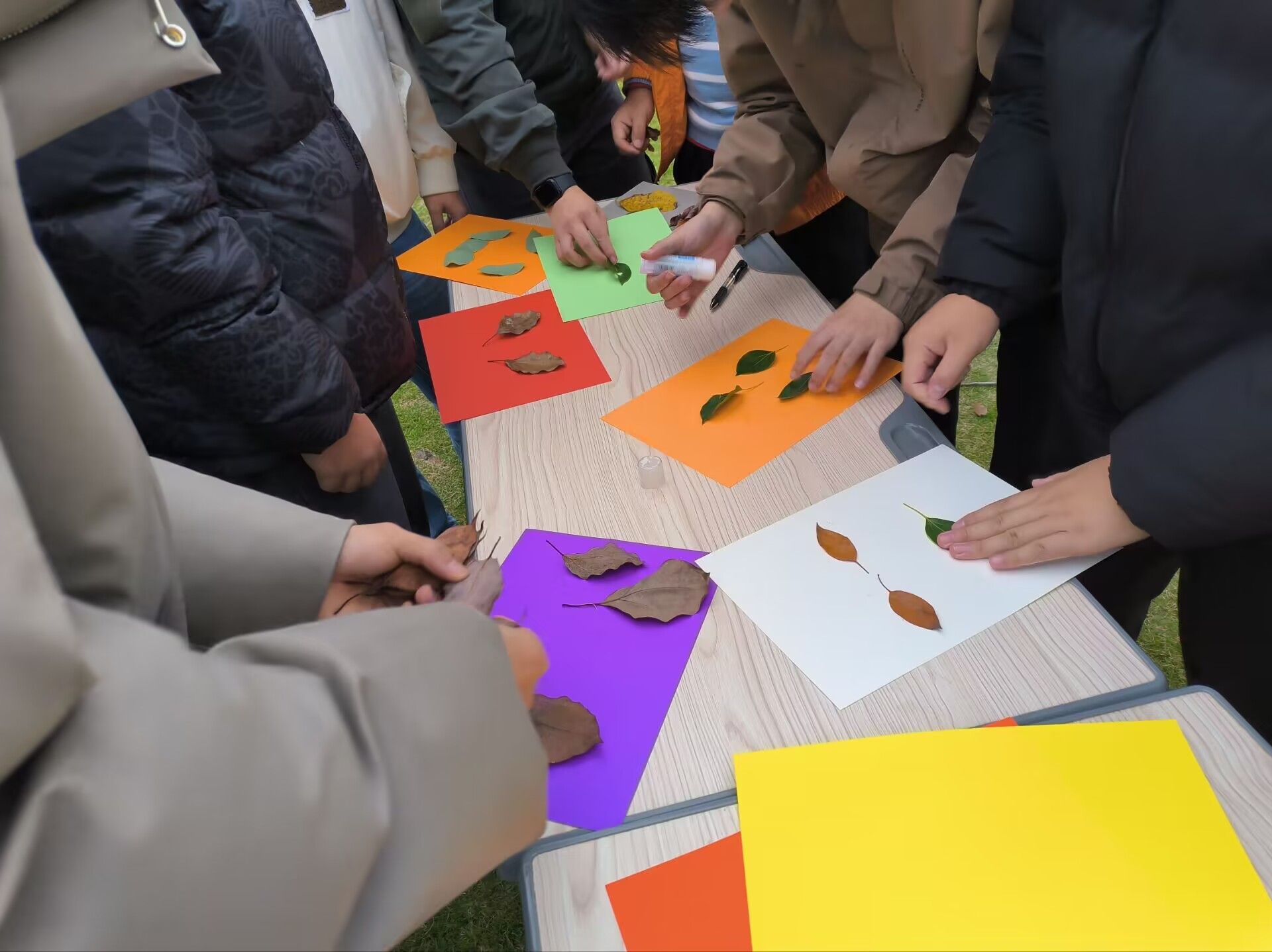 第二项活动,同学们自主思考拼接图形,并把树叶组成图形粘贴到底板上,形成一个个生动的图画,同学们的奇思妙想跃然纸上。
