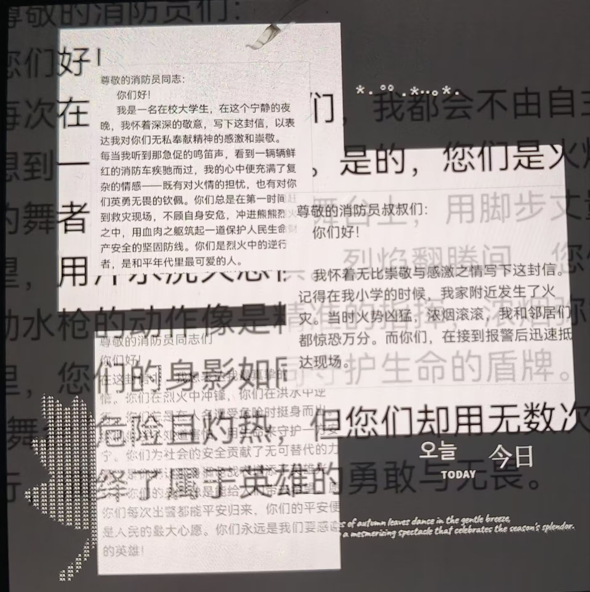 为拉近消防员与大学生的距离,表达大学生对消防员的感激与敬佩,也为表示“消防就在身边”,提高学生们的警觉,我班面向全校收集了学生们写给消防员的慰问信,向默默付出的消防员们表达热情的问候与感谢。