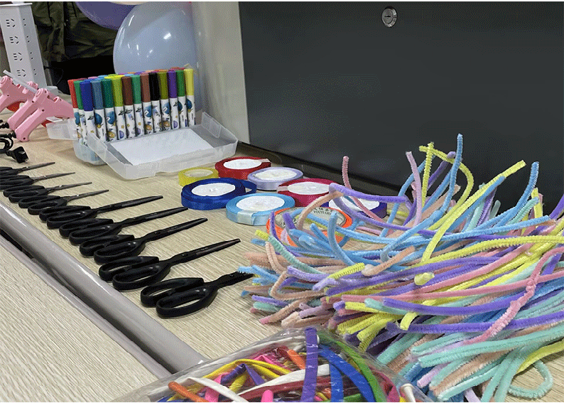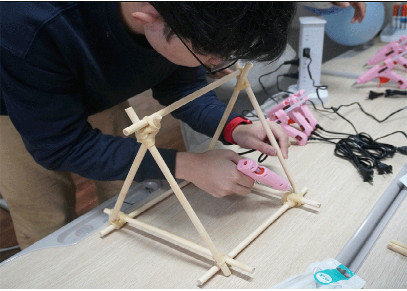 活动还未开始,同学们便跃跃欲试,拿着木棍比划着该如何制作投石车,思考着怎样能够击中纸板,想象着怎么装饰更美观。主持人活动开始口号一声令下,各个队伍便开始制作投石车,每一个队员都积极参与,固定木棍、粘胶水、装饰等等。