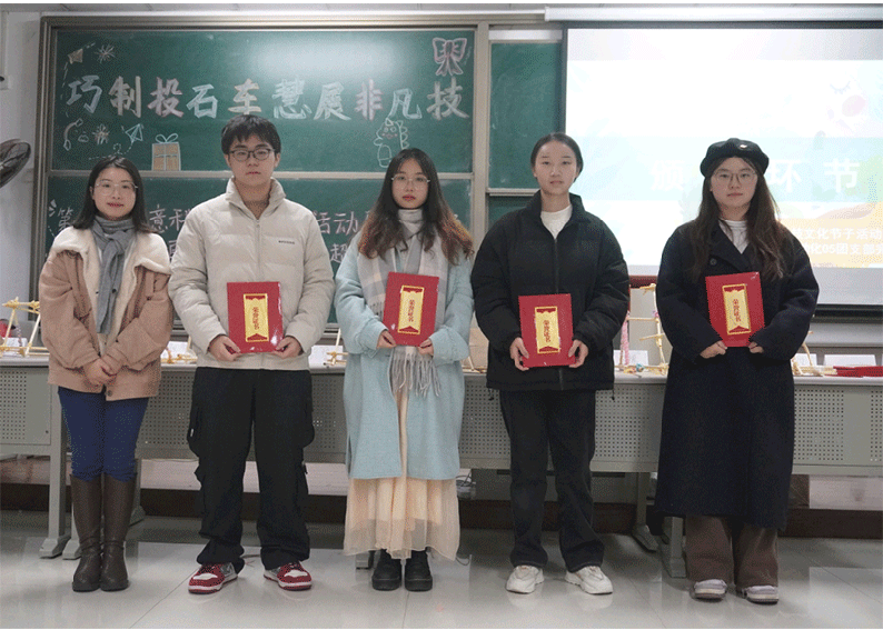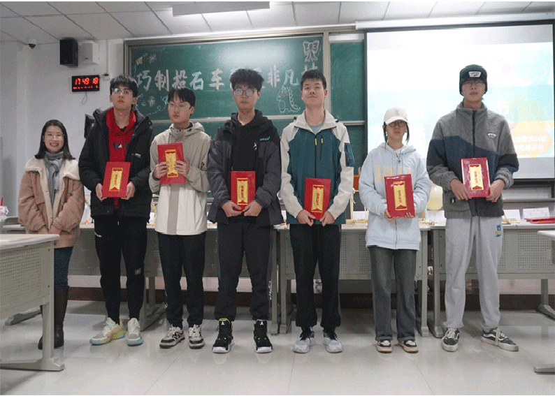 本次活动已然接近尾声,工作人员对评分进行统计排名并颁发获奖证书。本次活动通过动手制作投石车,不仅培养了同学们的团队协作与创新能力,更提升了他们的科学素养和动手能力,让学生在实践中观察、分析并掌握物理知识,激发他们对科技探索的兴趣,从而提高学习成效。最后,以一张大合照完满结束活动。